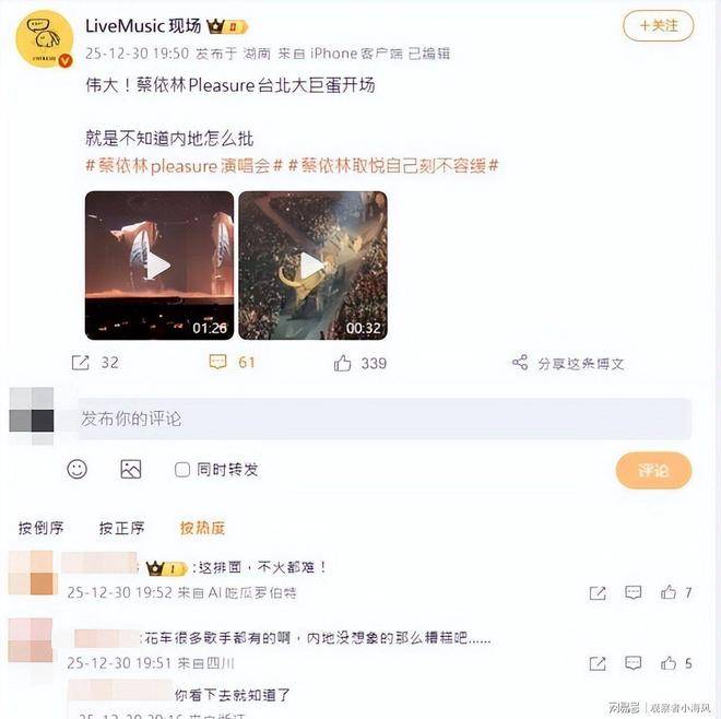 『社交媒体』上,网友们的留言多种多样,一部分人表达了对演唱会的高度期待,尤其是对巨蟒环节的创新性给予了高度评价。在评论区,也有一些网友回顾了『蔡依林』过去的大陆巡演情况,指出尽管有些表演元素曾被调整过,但整体演出依然获得了良好的口碑。因此,大家对这次PLEASURE巡演是否能够顺利通过审批过程,保留所有设计充满期待。巡演的规模相对较大,涉及多个城市,许多网友希望能够看到『蔡依林』完整的艺术创作,而不被任何形式的删减。 在众多评论中,有网友用不要阉割这一表述,传达了他们对表演完整性的强烈关注。这一词语频繁出现在热评中,反映出大家对『蔡依林』演唱会设计的珍视与期待。他们希望,尽可能保留与台北站相同的设计,届时将为大陆歌迷带来更加震撼的视听体验。而对于巡演的票务信息,也已经有部分公布,深圳站作为首站,引发了大量关注。不过,也有一些质疑的声音开始涌现,这也为讨论带来了新的层面。