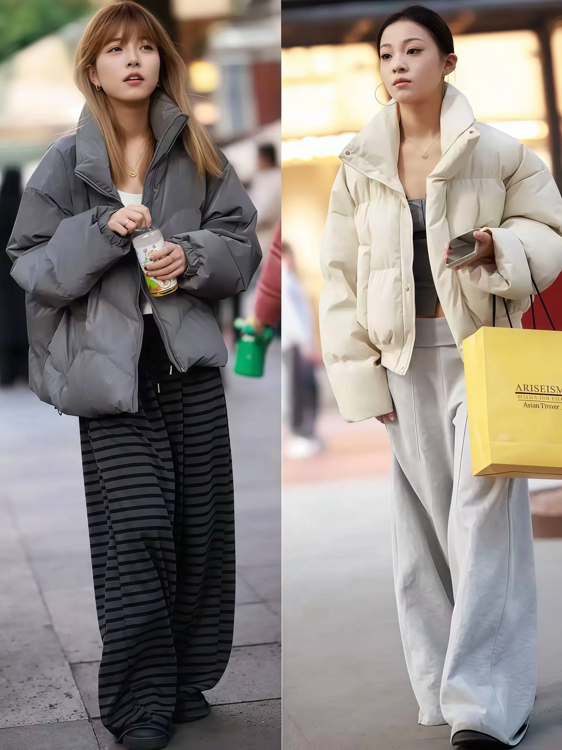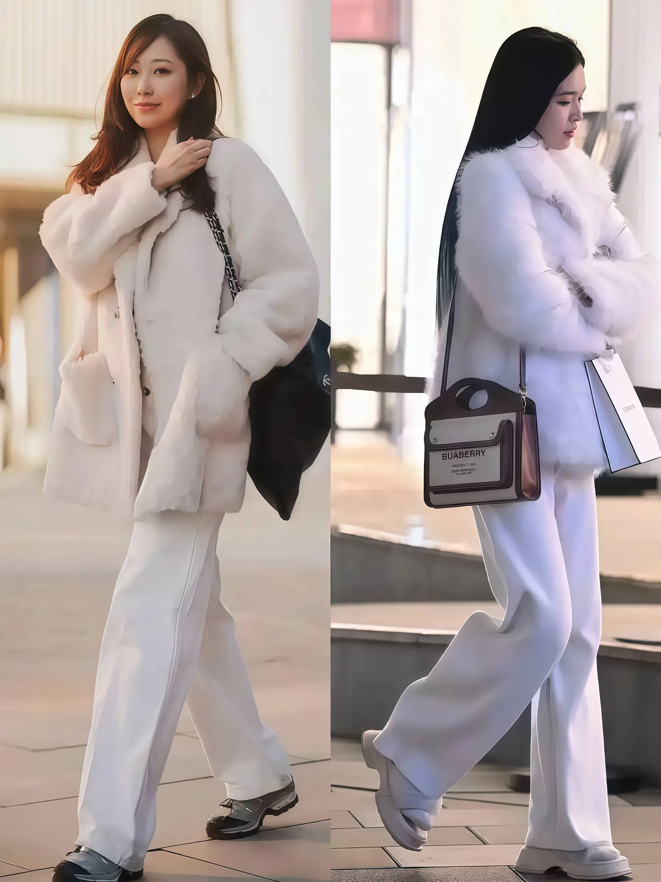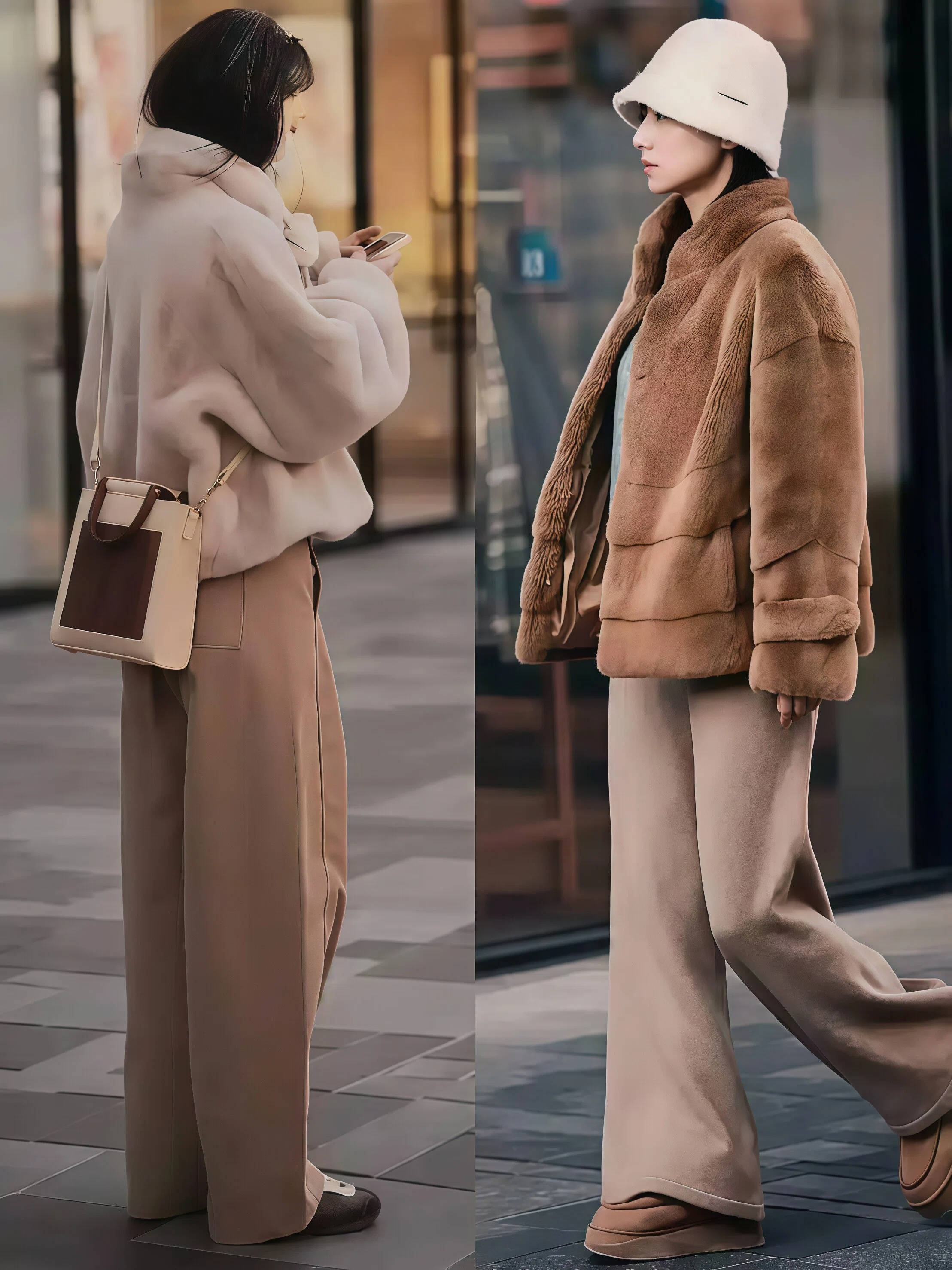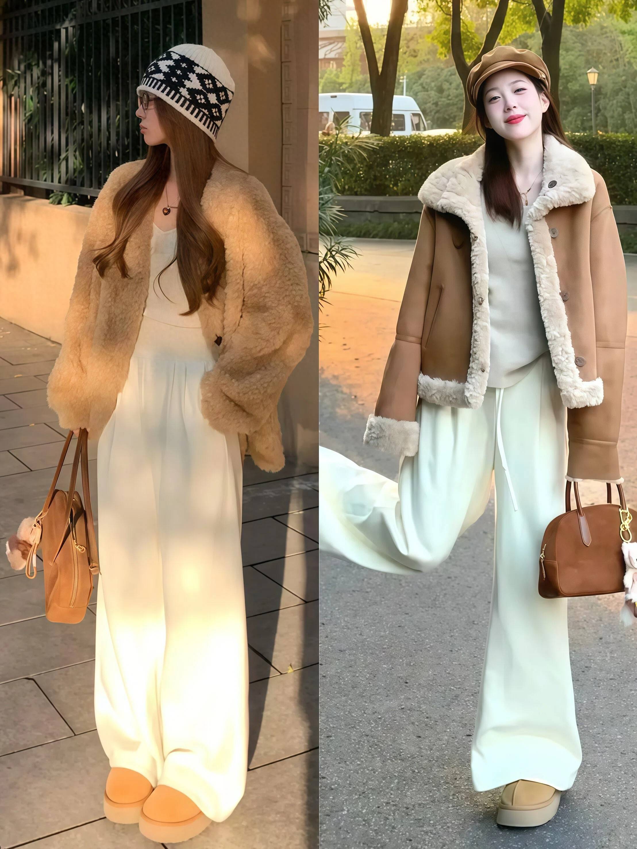 冬天的街头到处都是黑灰深蓝,这时候你穿一身浅色就会特别出挑。白色、奶油色、浅驼色的短外套🧥配同色系阔腿裤,走在路上很容易吸引目光。