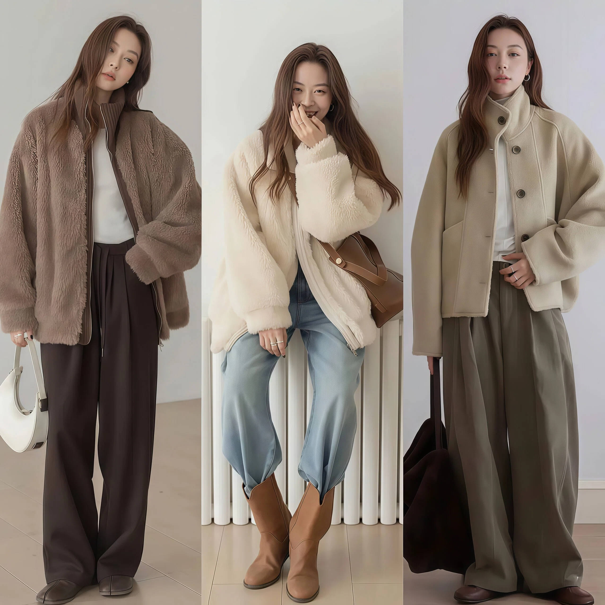 如果你拿捏不准配色,就记住“上深下浅”这个公式。深色短外套🧥配浅色阔腿裤,是冬天最经典也最不容易出错的搭配,深色上衣能收缩上半身的视觉体积,浅色裤子能延伸腿部的线条。两者加在一起,会让整个人看起来更挺拔,而且深色外套🧥更耐脏,冬天不用天天洗也不会显旧。