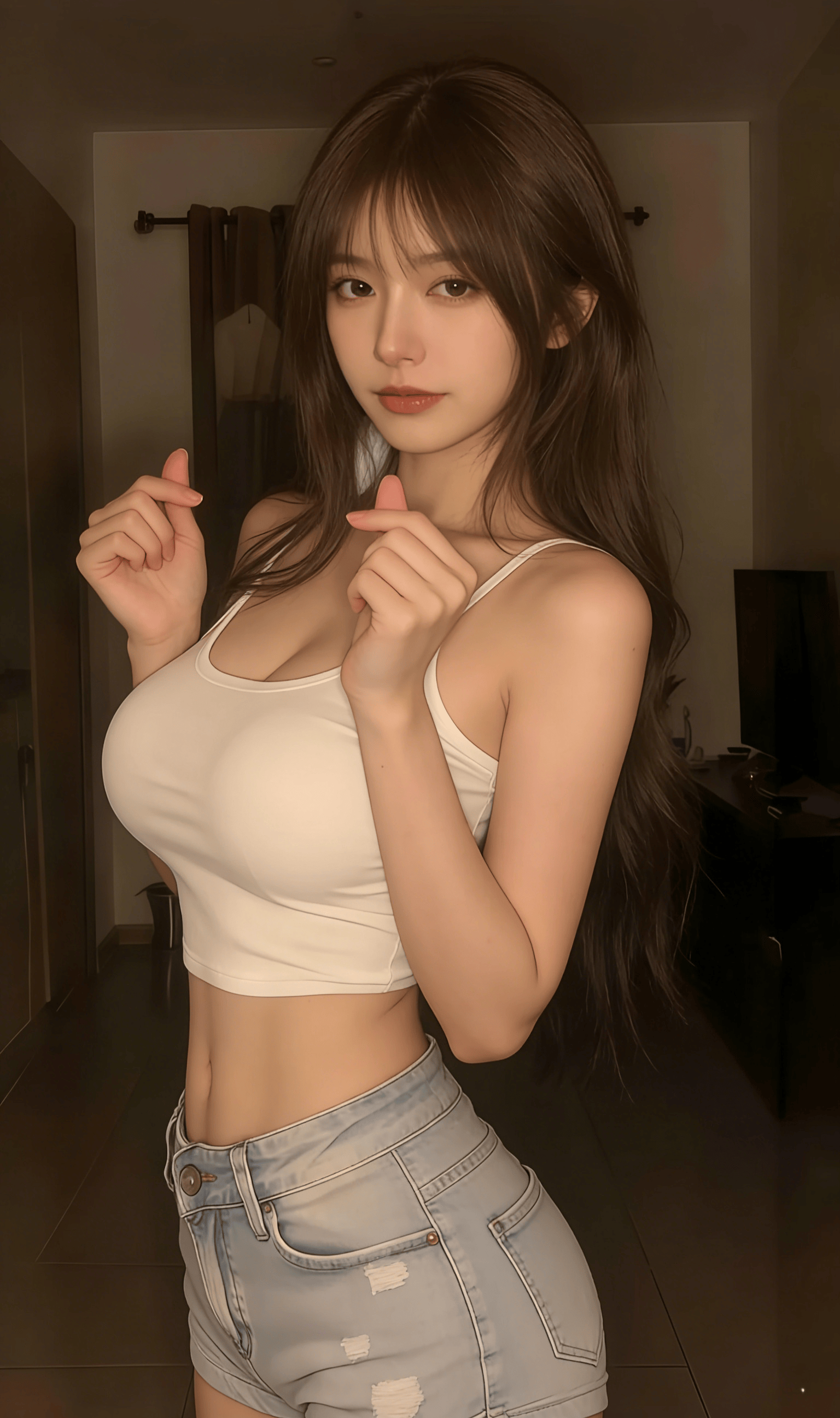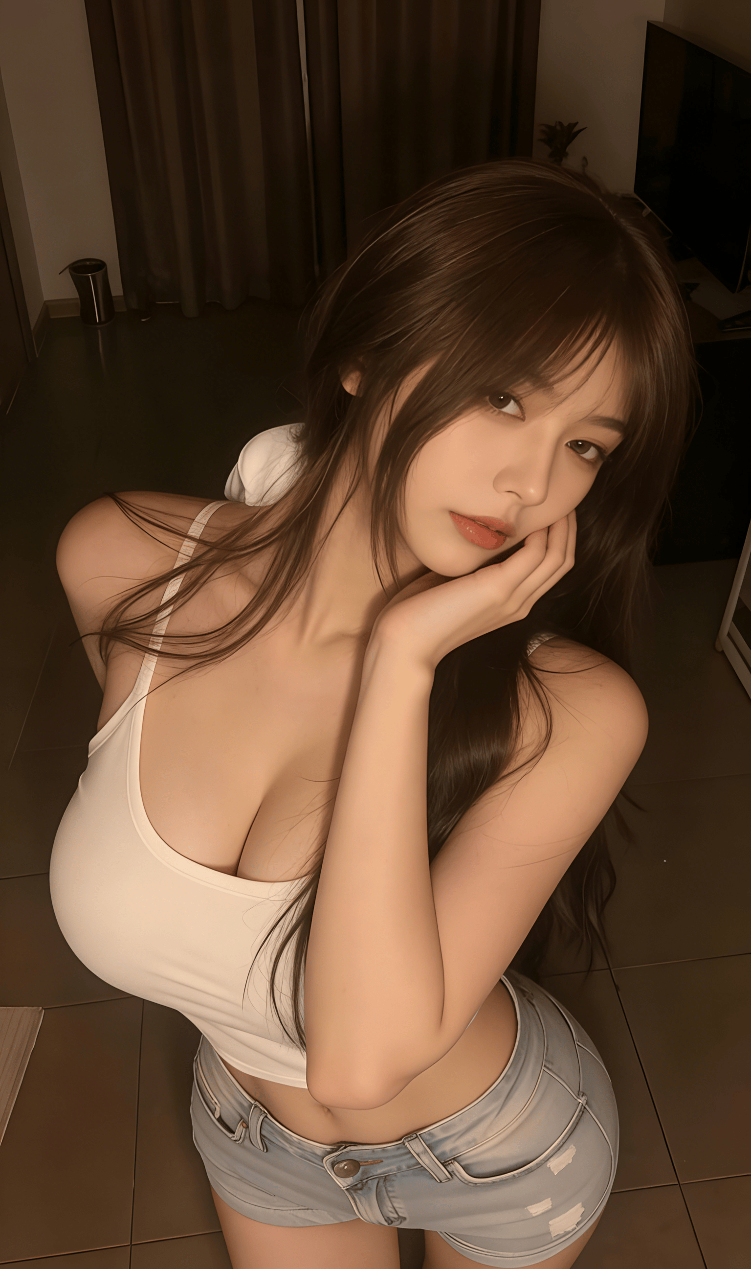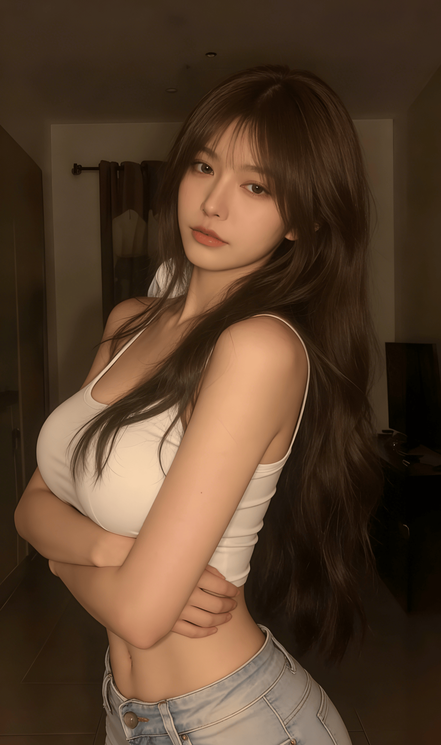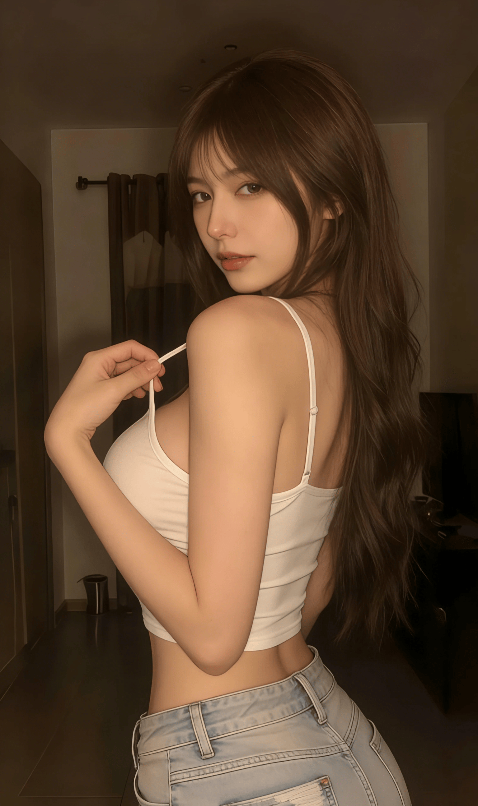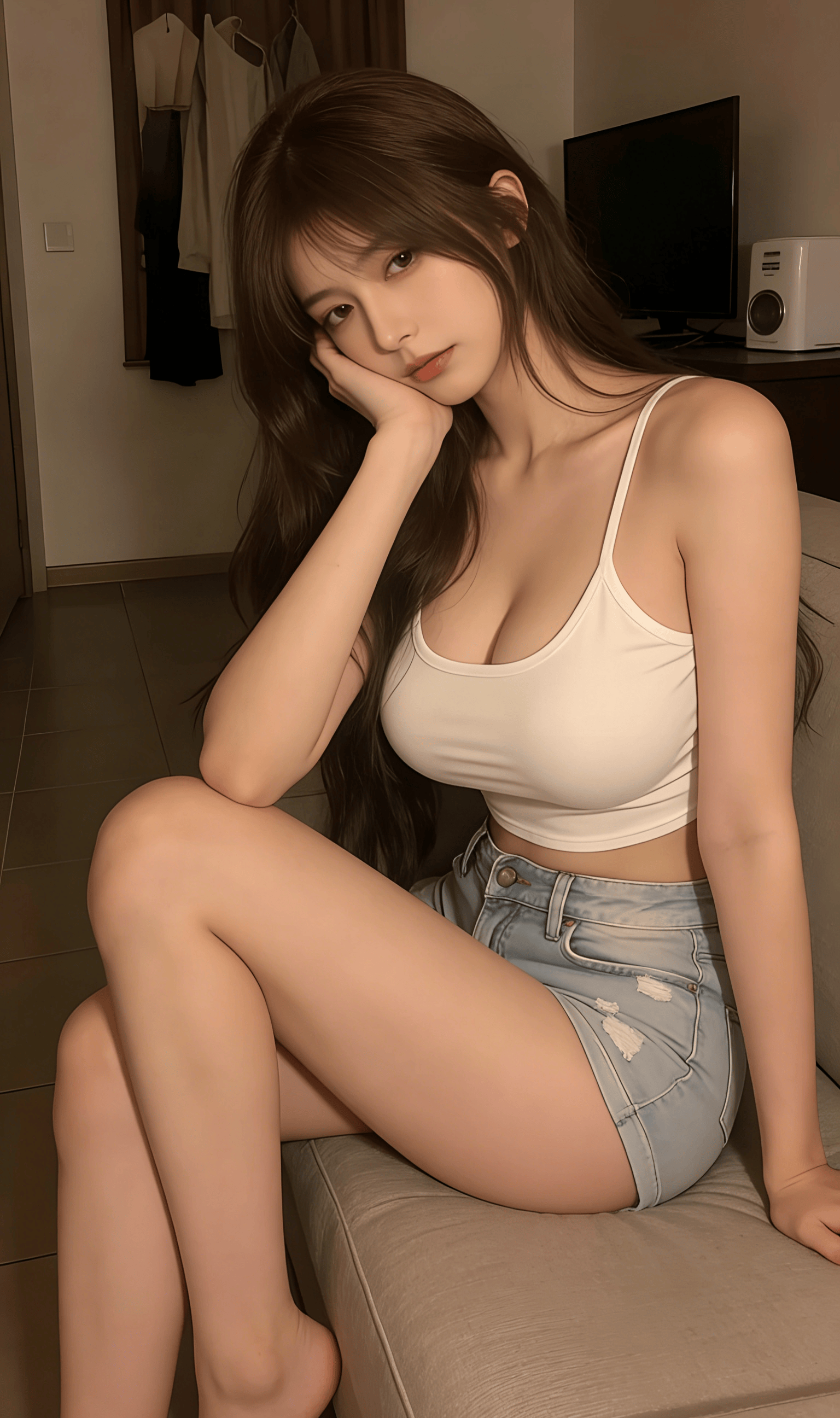 蓬松的深棕卷发蹭过白色吊带的边缘,柔软布料贴着肌肤勾勒出圆润曲线,没有紧绷的束缚感,只剩恰到好处的贴合。洗得发白的牛仔短裤🩳带着毛边,金属扣在暖光里泛着细碎冷光,中和了吊带的柔媚,添了几分随性不羁。她半垂着眼,唇瓣轻启,姿态慵懒得像刚从午后的眠意里醒来,没刻意凹造型,却在松弛里透着不自知的撩人。