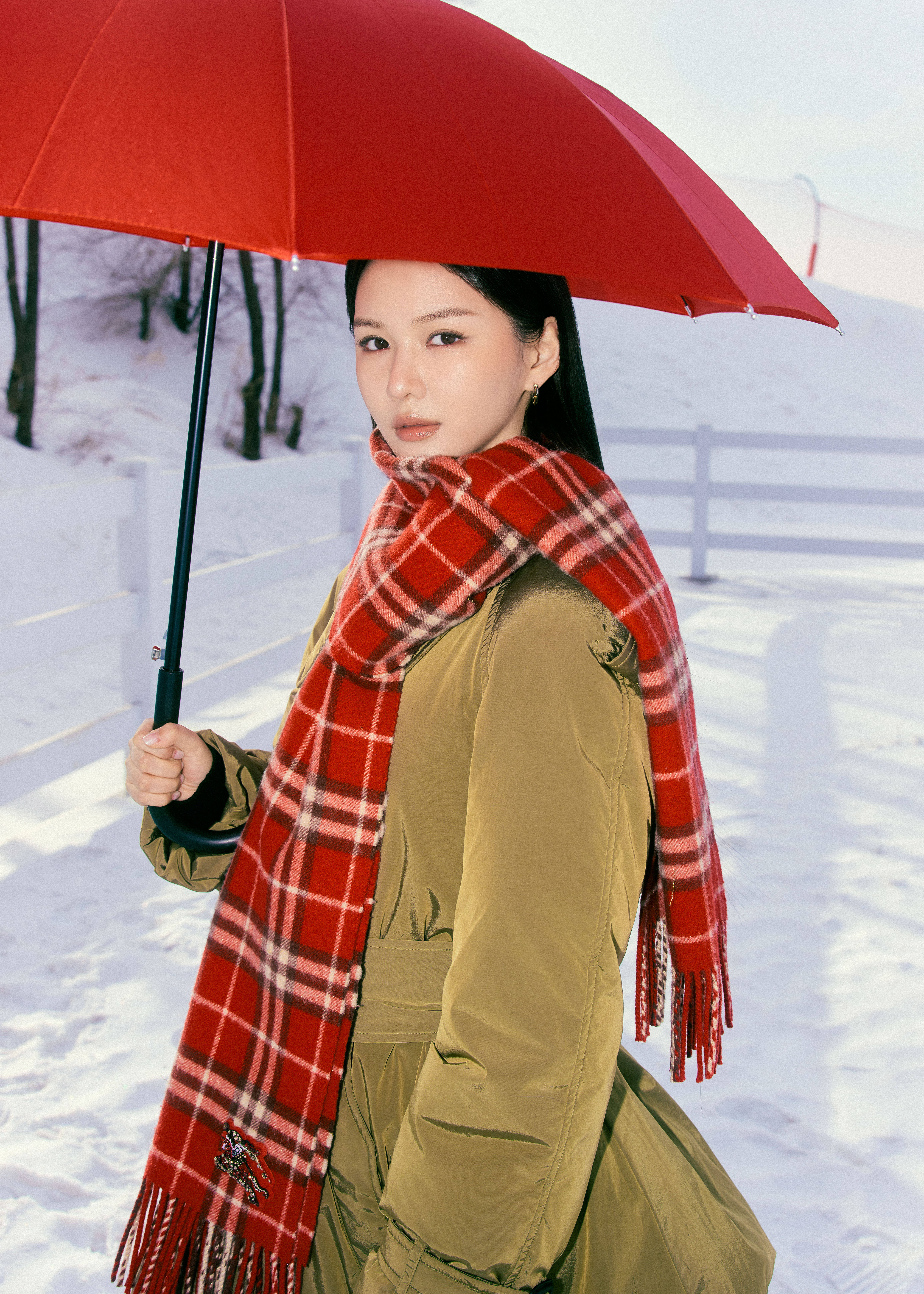 她身上这件橄榄绿收腰羽绒服,自带复古英伦气质,搭配经典红格纹围巾🧣,在纯白雪地的映衬下,既保暖又充满故事感。宽檐红伞、利落长靴与藏蓝色『马鞍包』的组合,像极了冬日恋歌里走出的女主角🎭️,清冷又温柔,每一张抓拍都自带冬日韩剧名场面滤镜。