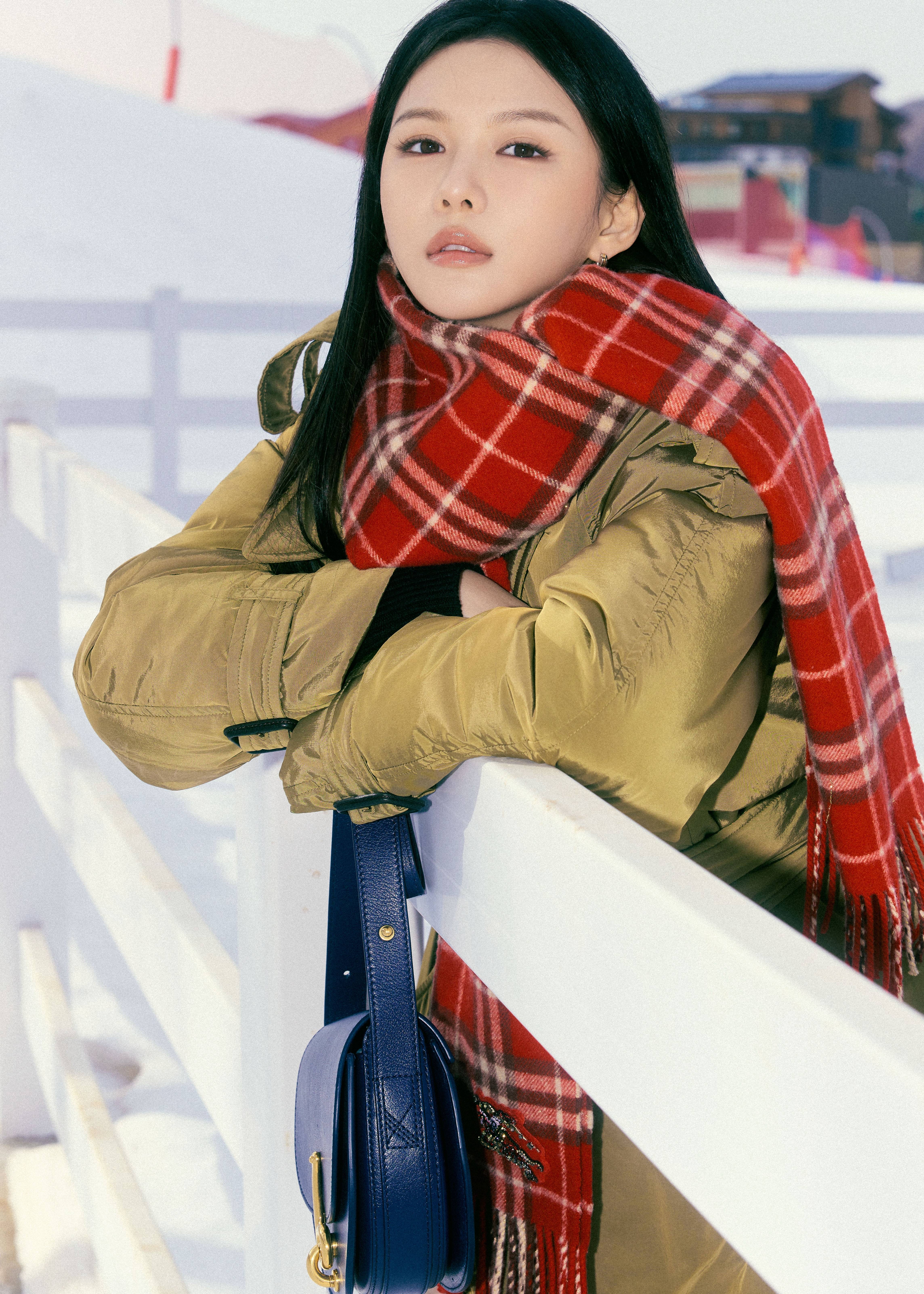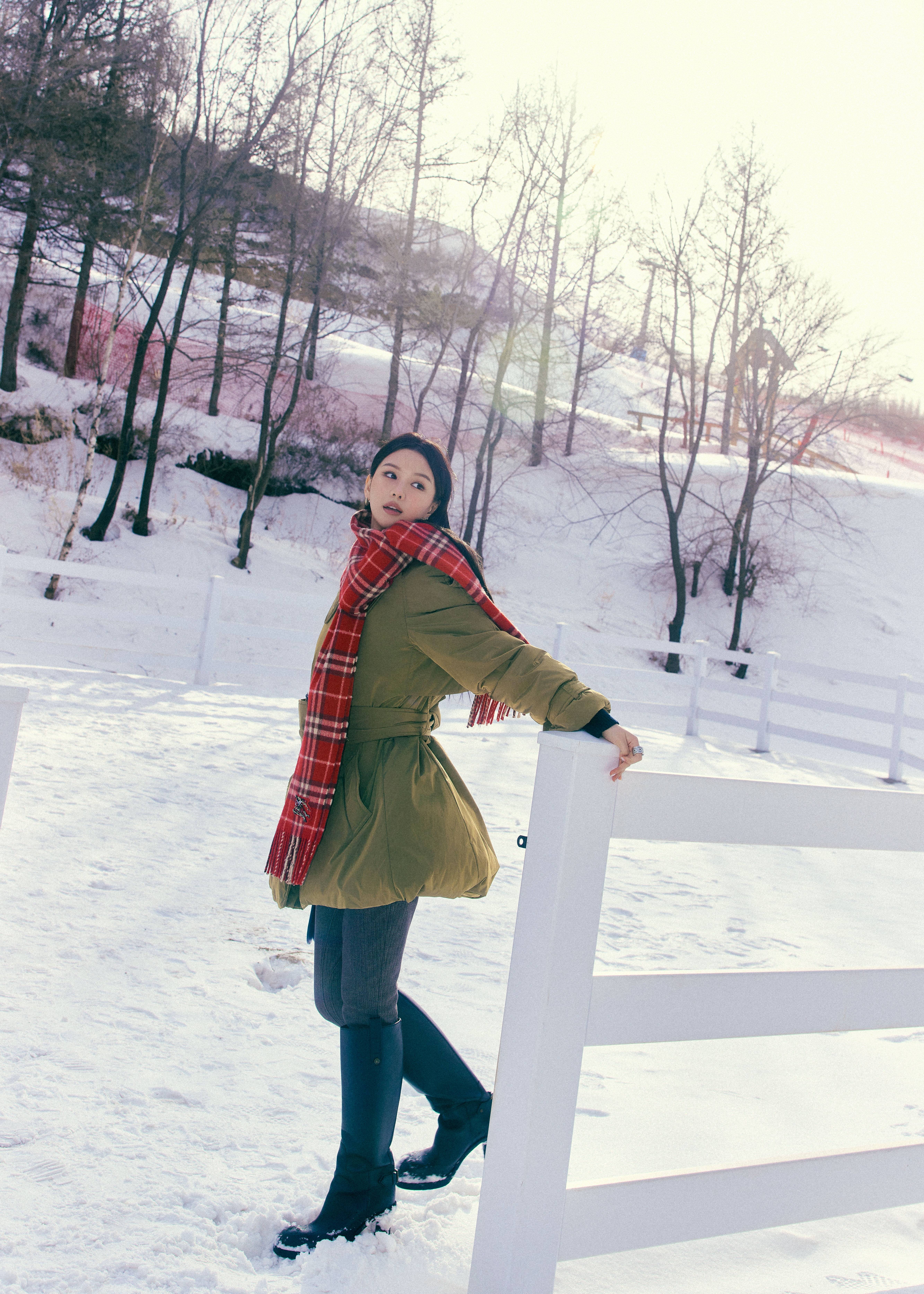 无论是倚靠在白色围栏的松弛感 pose,还是红砖墙前的清冷定格,她都能精准拿捏镜头语言。雪地俯拍视角下,红伞与格纹围巾🧣形成视觉焦点,羽绒服的蓬松质感与收腰设计在动态中展现出层次,让每一张照片都兼具叙事感与高级感,完全达到了时尚大片的出片标准。