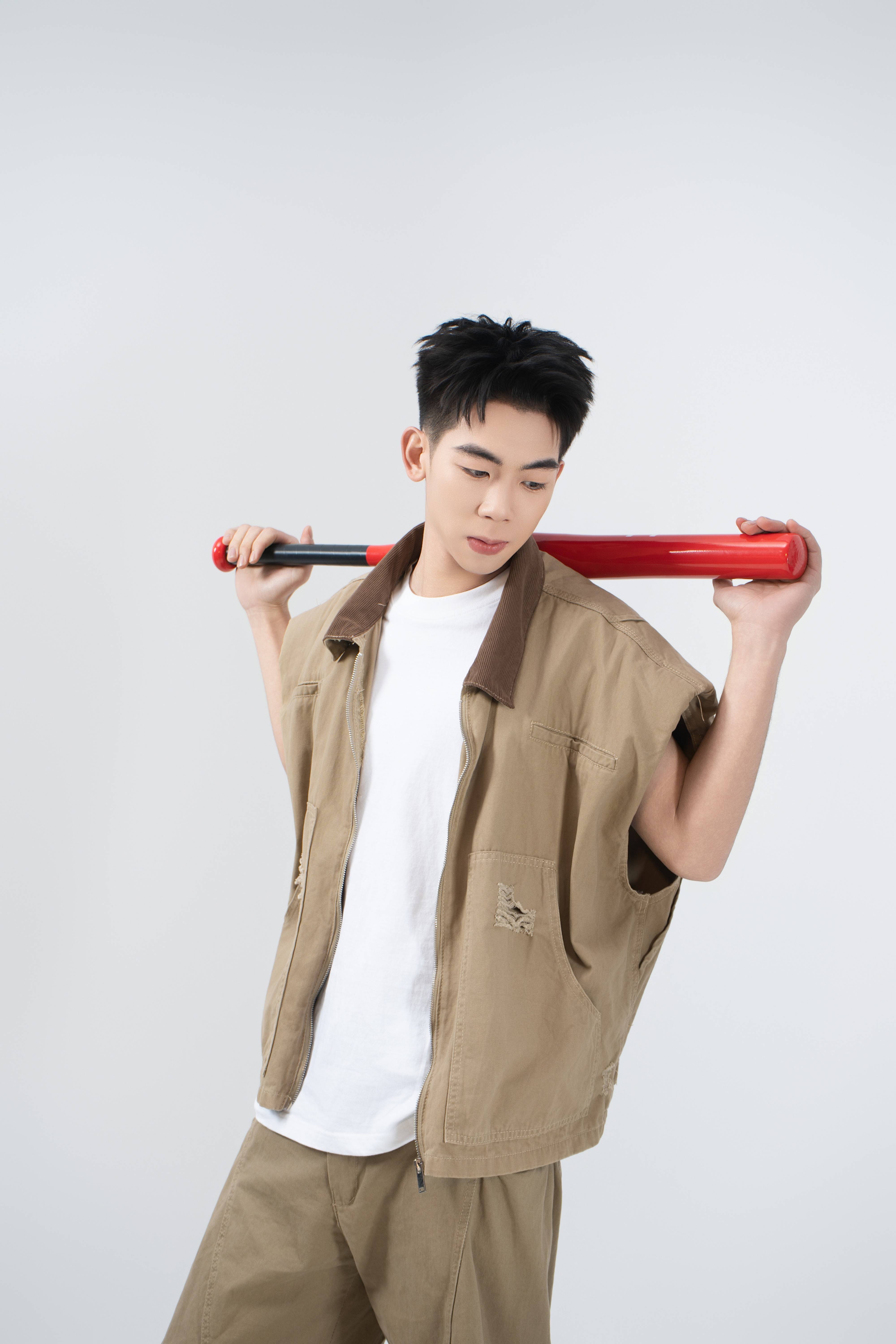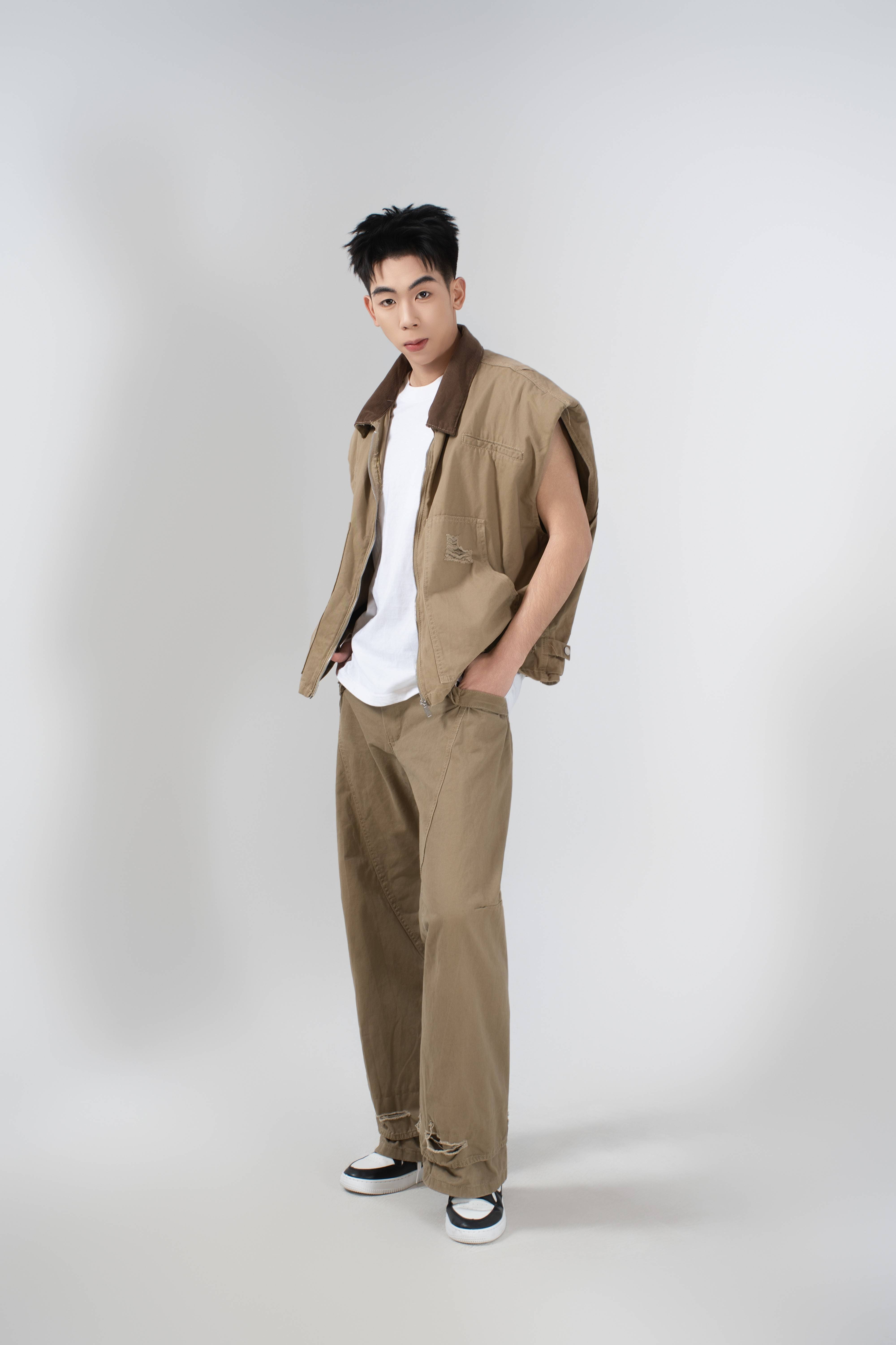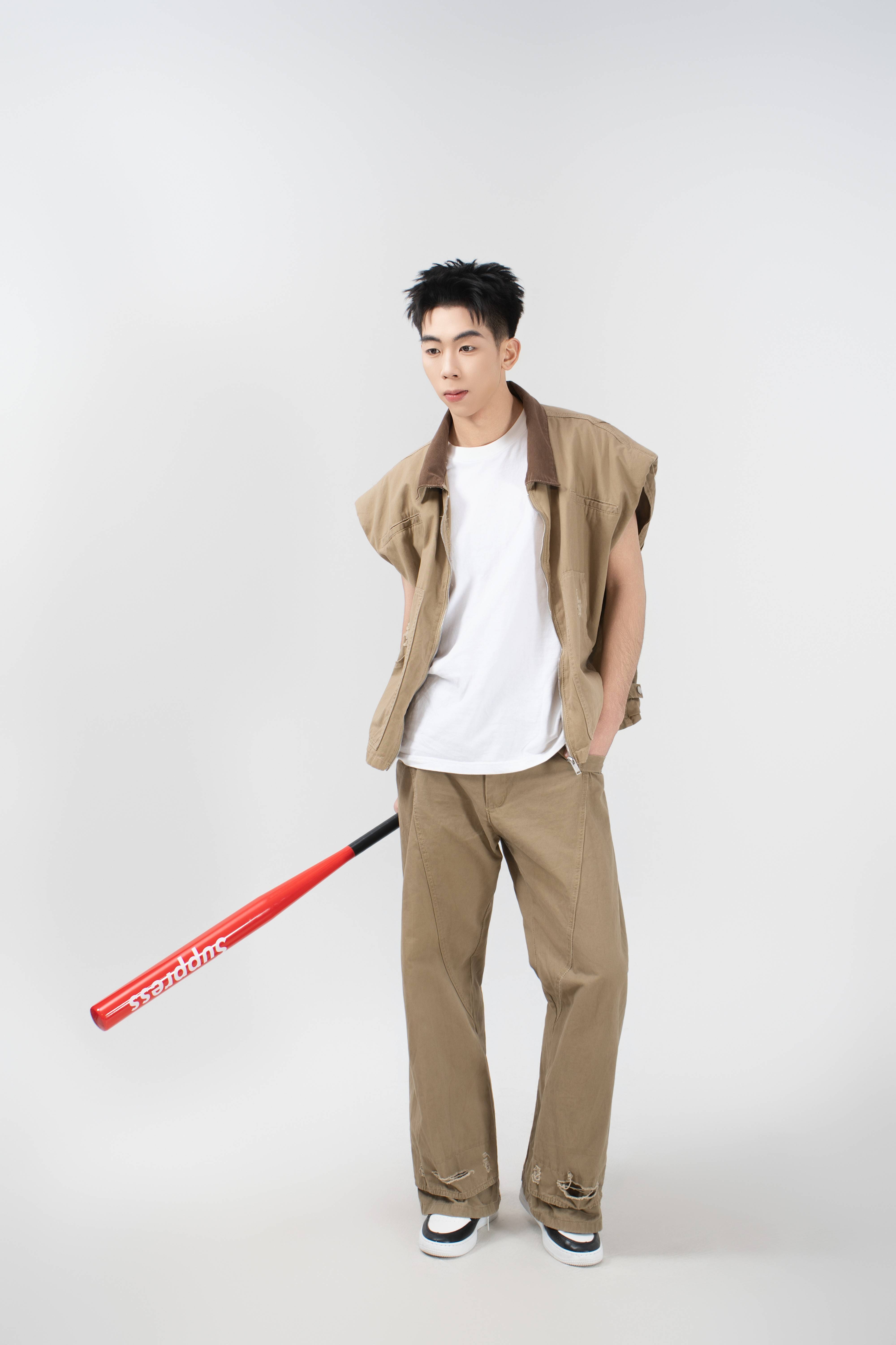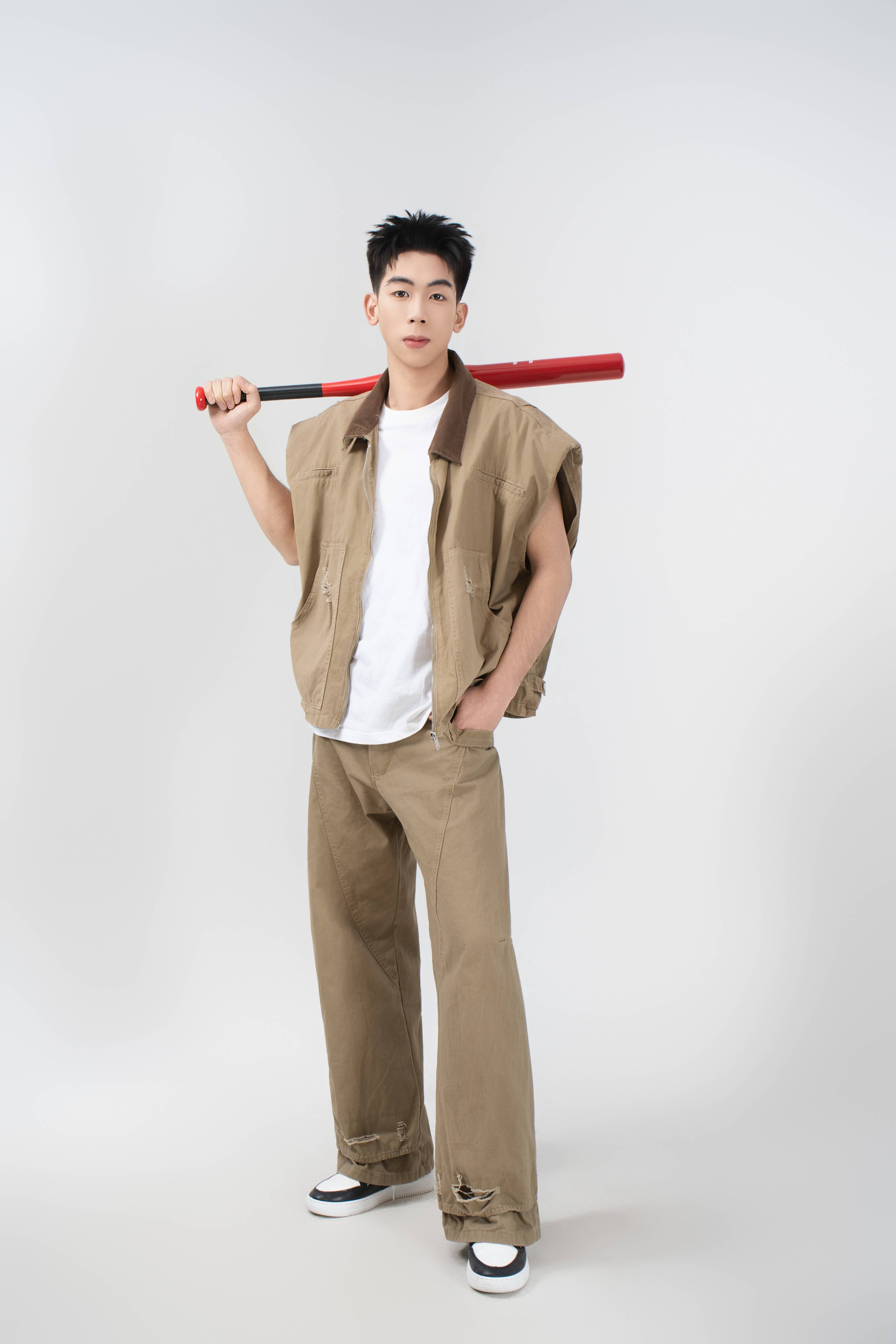 当工装马甲替代西装外套🧥,李乐彬的气质立刻完成了一次鲜活的转场。卡其色面料带着水洗后的柔软质感,白T恤👕露出的领口和袖口,消解了工装的硬朗。他双手插兜站立时,裤脚的磨边设计与黑白帆布鞋呼应出随性的街头感;当红色棒球棒搭在肩头,身体微微前倾的瞬间,又多了几分美式青春片里少年的不羁。这套造型里没有刻意的“耍酷”,只有他对“日常感”的精准捕捉——就像周末约上朋友去打球的大男孩,带着未经修饰的鲜活与张力。他让工装不再是“硬核机能风”的代名词,而是变成了少年感与生命力的载体。