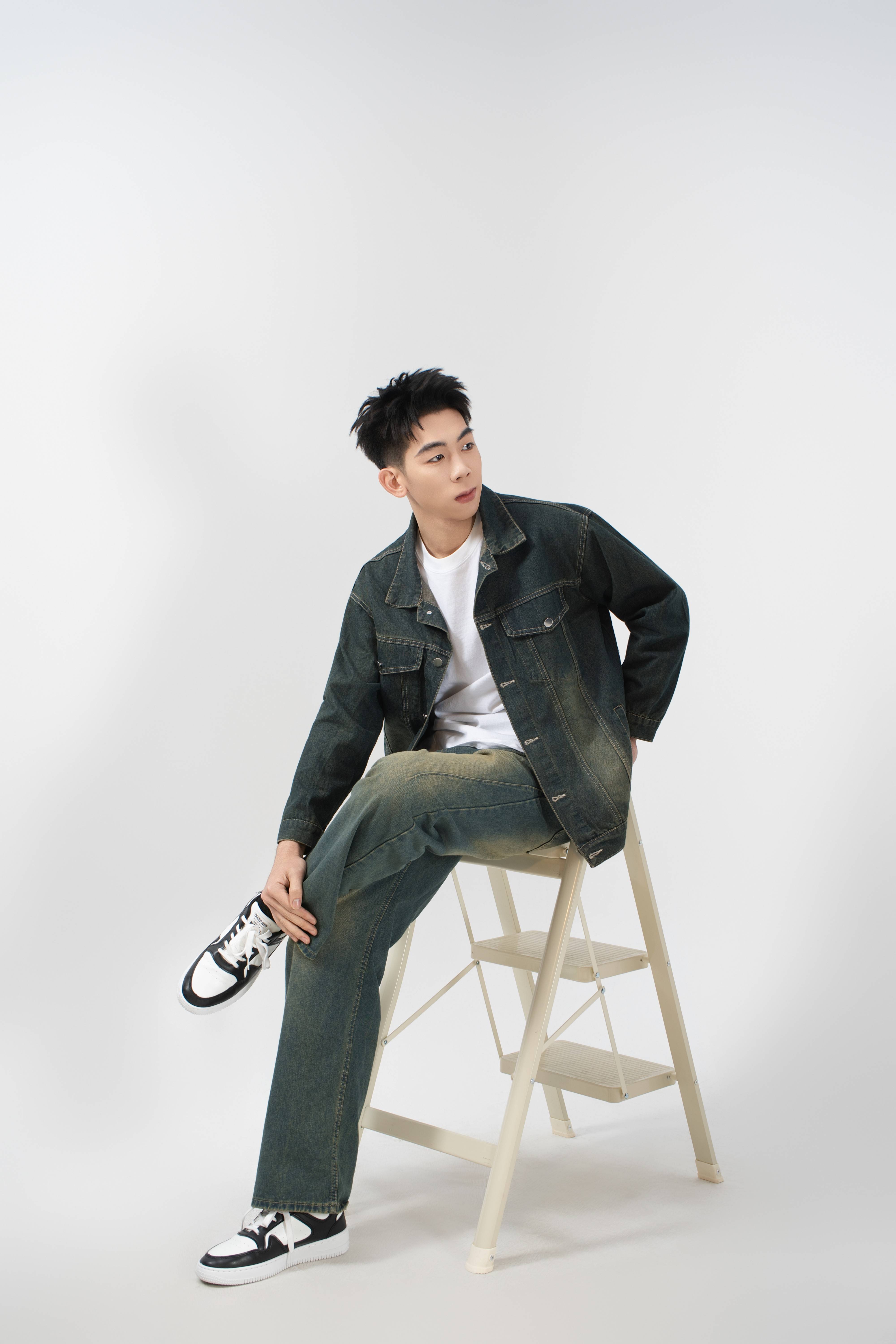 牛仔套装的登场,则让我们看到了李乐彬身上更复古也更随性的一面。做旧水洗的『牛仔外套』🧥带着岁月沉淀的纹理,内搭白T恤👕的简约让整体造型更显清爽。他坐在透明餐椅上,手肘搭在椅背上,指尖轻触外套🧥领口的动作自然又松弛;当他登上白色梯架,单腿抬起的瞬间,牛仔裤👖的垂坠感与『运动鞋』的活力完美融合。这套造型里没有刻意营造的“复古滤镜”,只有他对“松弛感”的绝佳演绎——就像巷口便利店前偶遇的少年,穿着洗得发白的牛仔,带着漫不经心的帅气。他让牛仔跳出了“复古复刻”的套路,变成了当代年轻人自在生活的缩影。