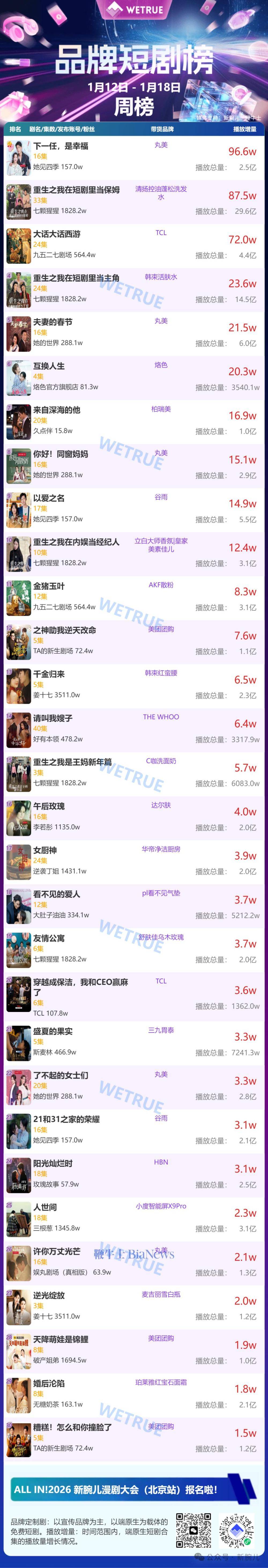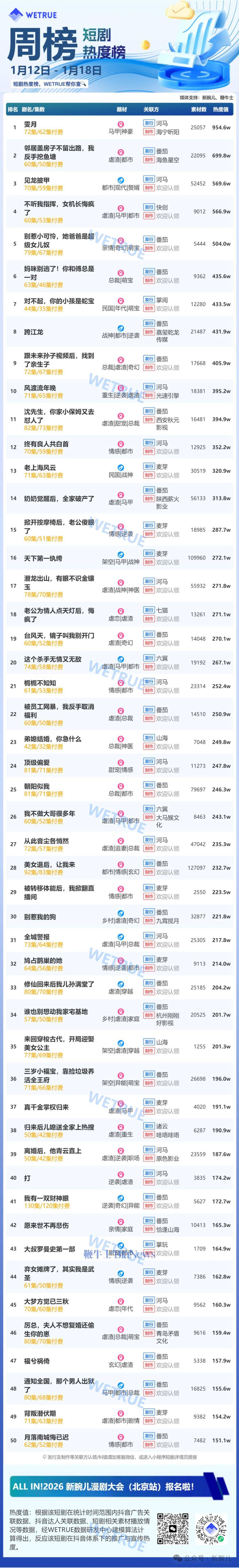 新腕儿 周榜1月19日,新腕儿、鞭牛士联合WETRUE一点查剧共同推出1月第3周短剧(付费、免费、品牌和端原生)&漫剧周榜。数据时间周期:1月12日-1月18日
