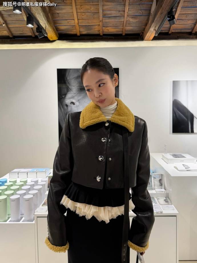 当然这一套内搭的外搭,也很值得借鉴!喜欢穿短款夹克的Jennie,这次选择的短款皮毛一体的短皮衣,既时尚又帅气!