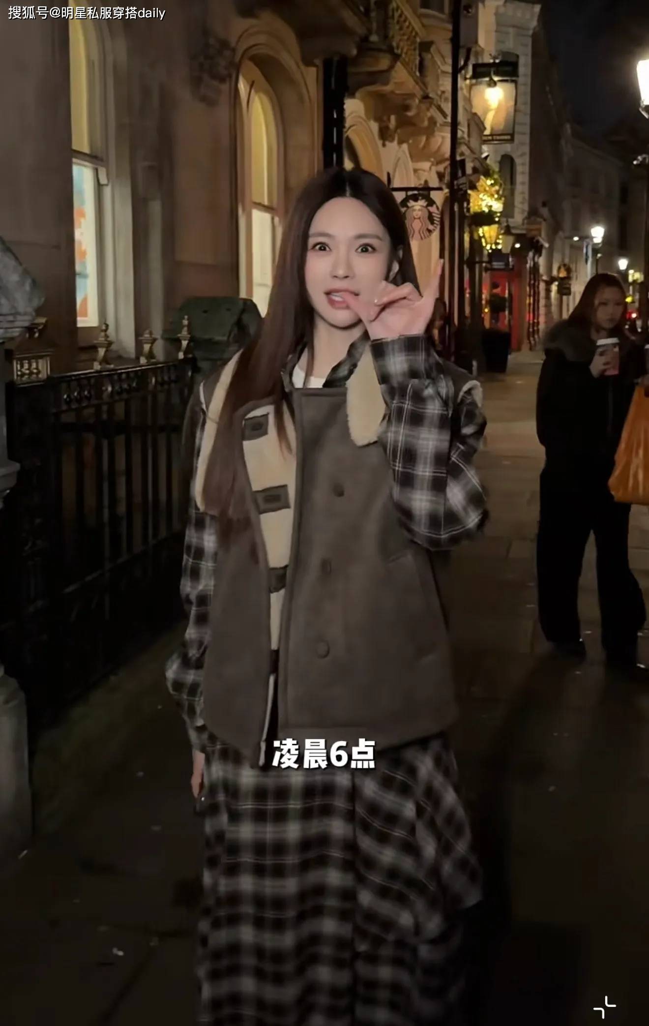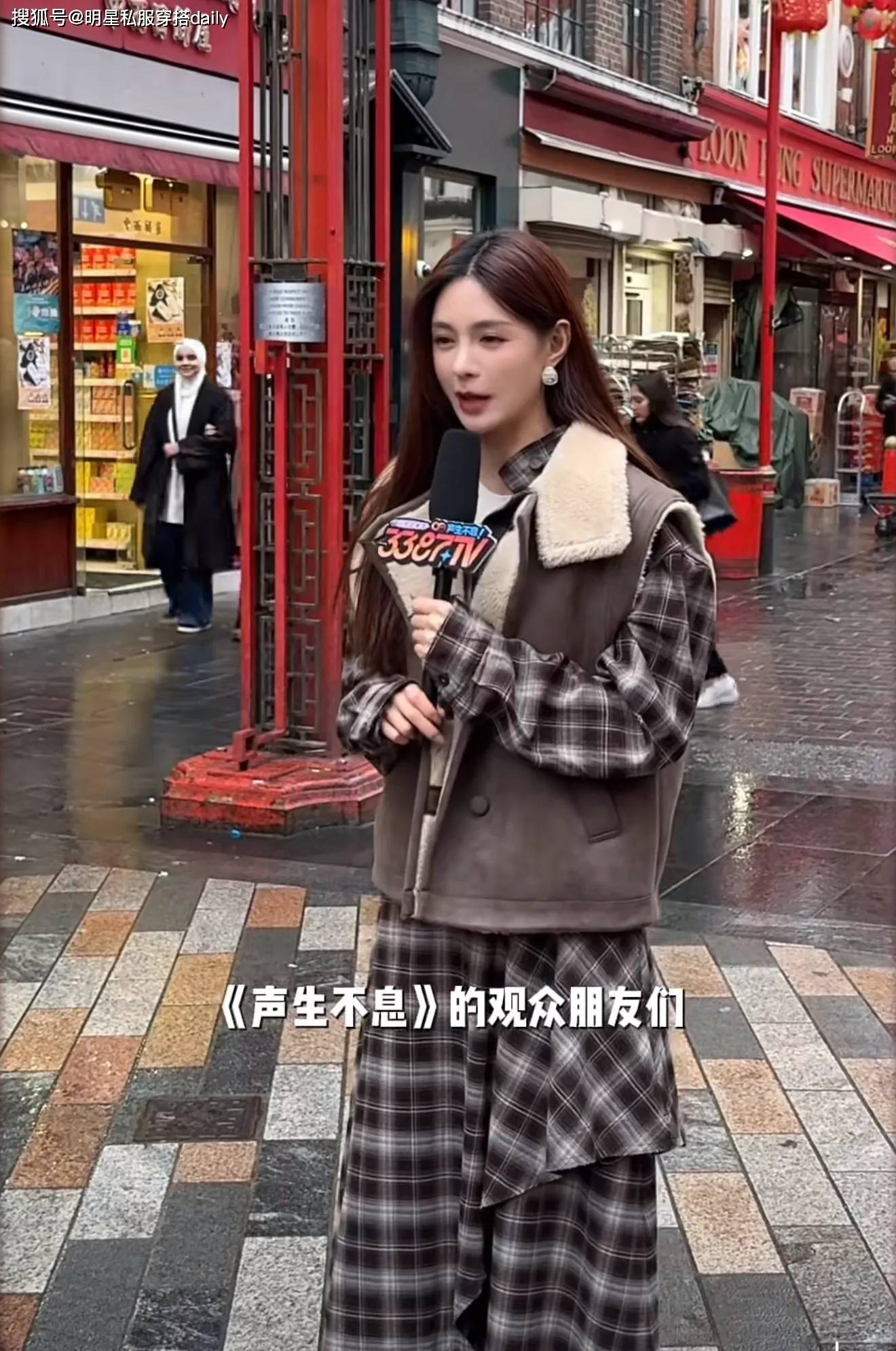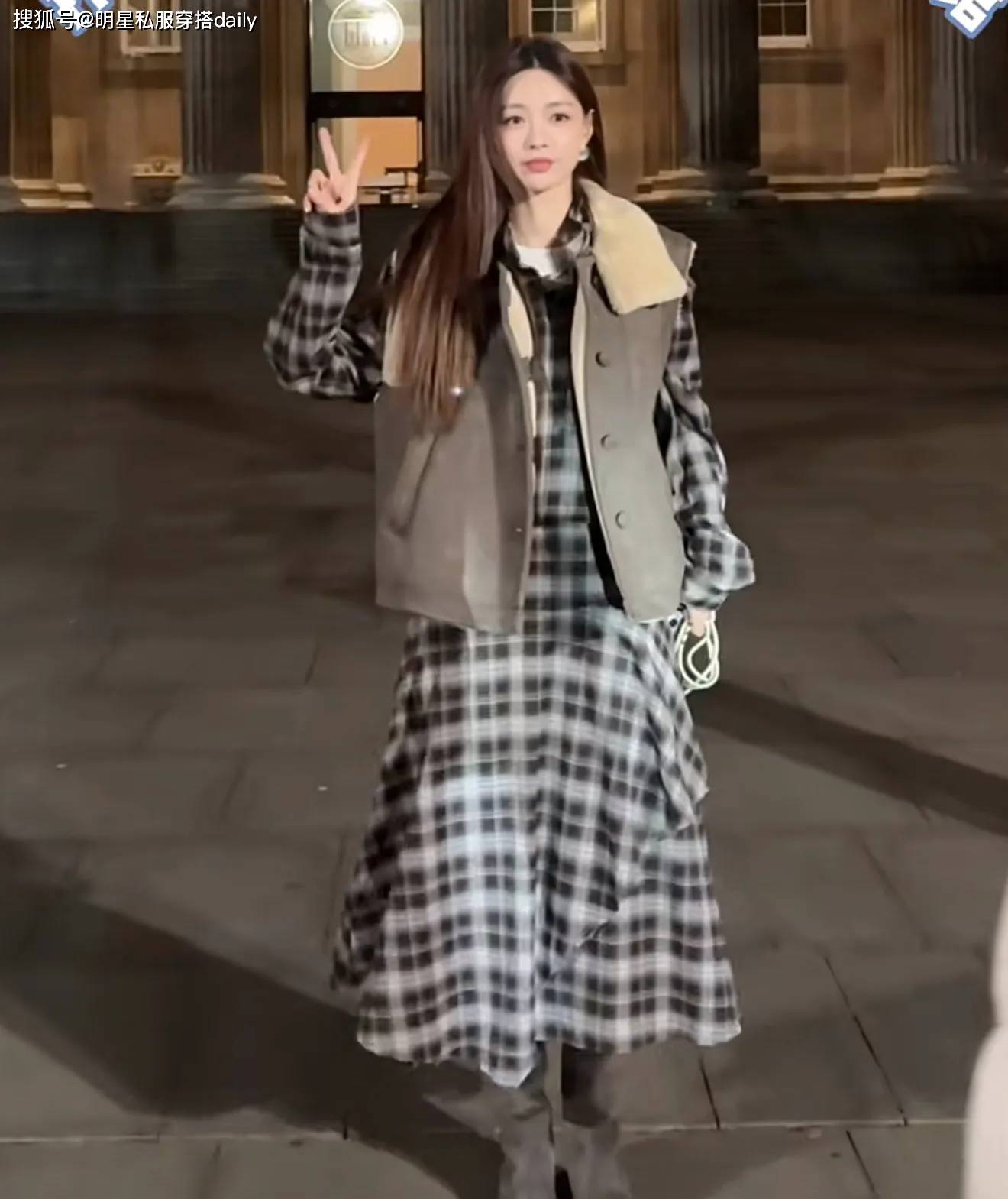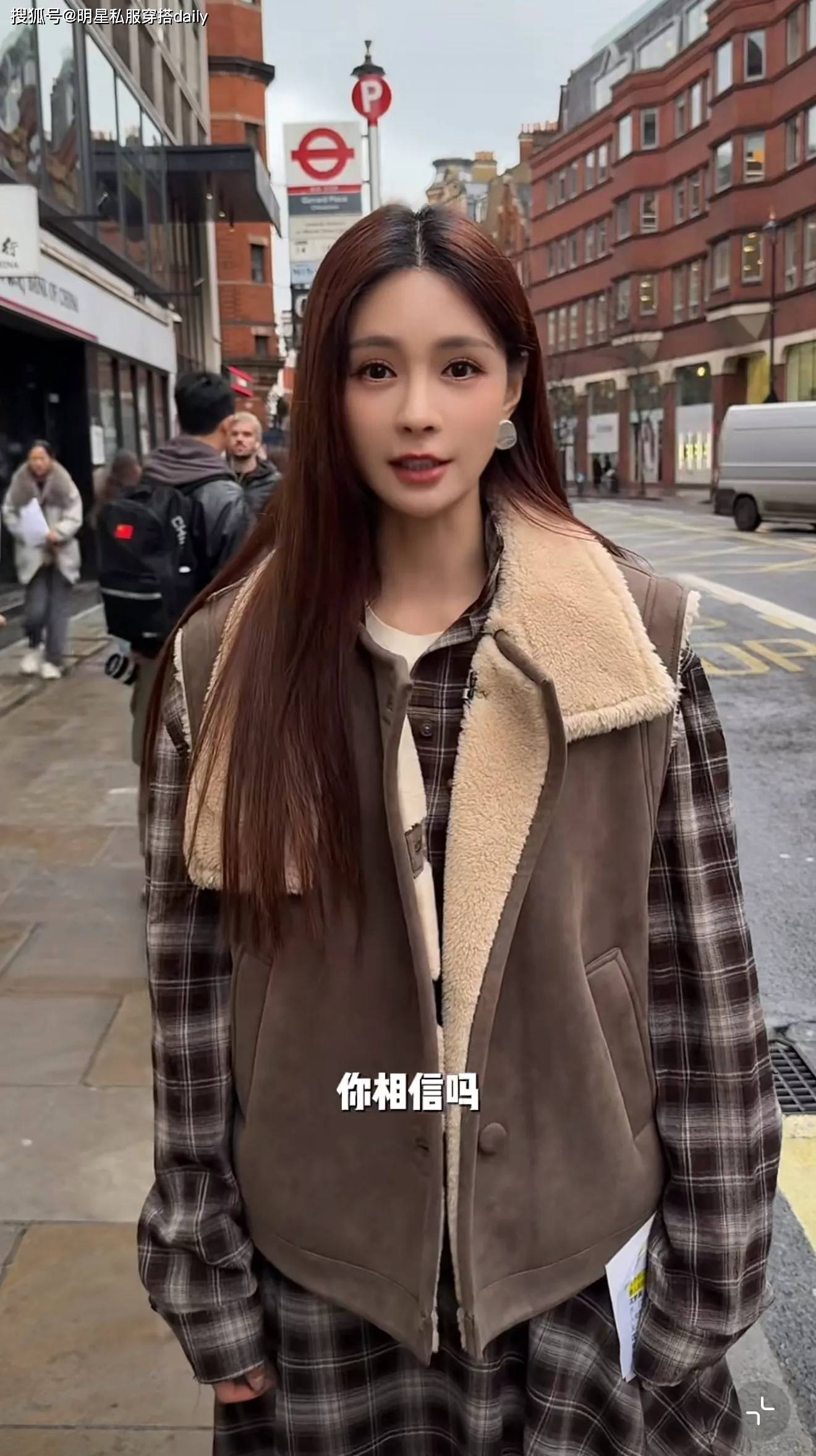 皮毛一体的马甲背心,保暖又时尚!她选择了一款棕色皮毛一体外套🧥,内搭也选择了同色系,但是不同花纹的长袖格纹裙,这样叠搭,唯美又时尚!