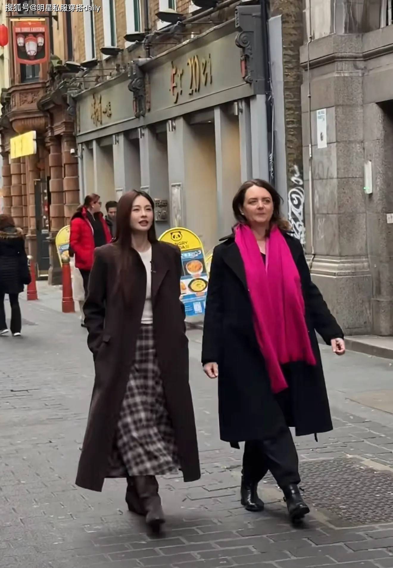 在伦敦当然要穿格纹了!『沈梦辰』后来选择了一款棕色长款毛呢大衣,垫肩设计突出她的直角肩,御姐气场拉满!内搭白色修身T恤👕,下半身搭配了英伦范儿十足的半身长裙👗,整个人看起来帅气又保暖!