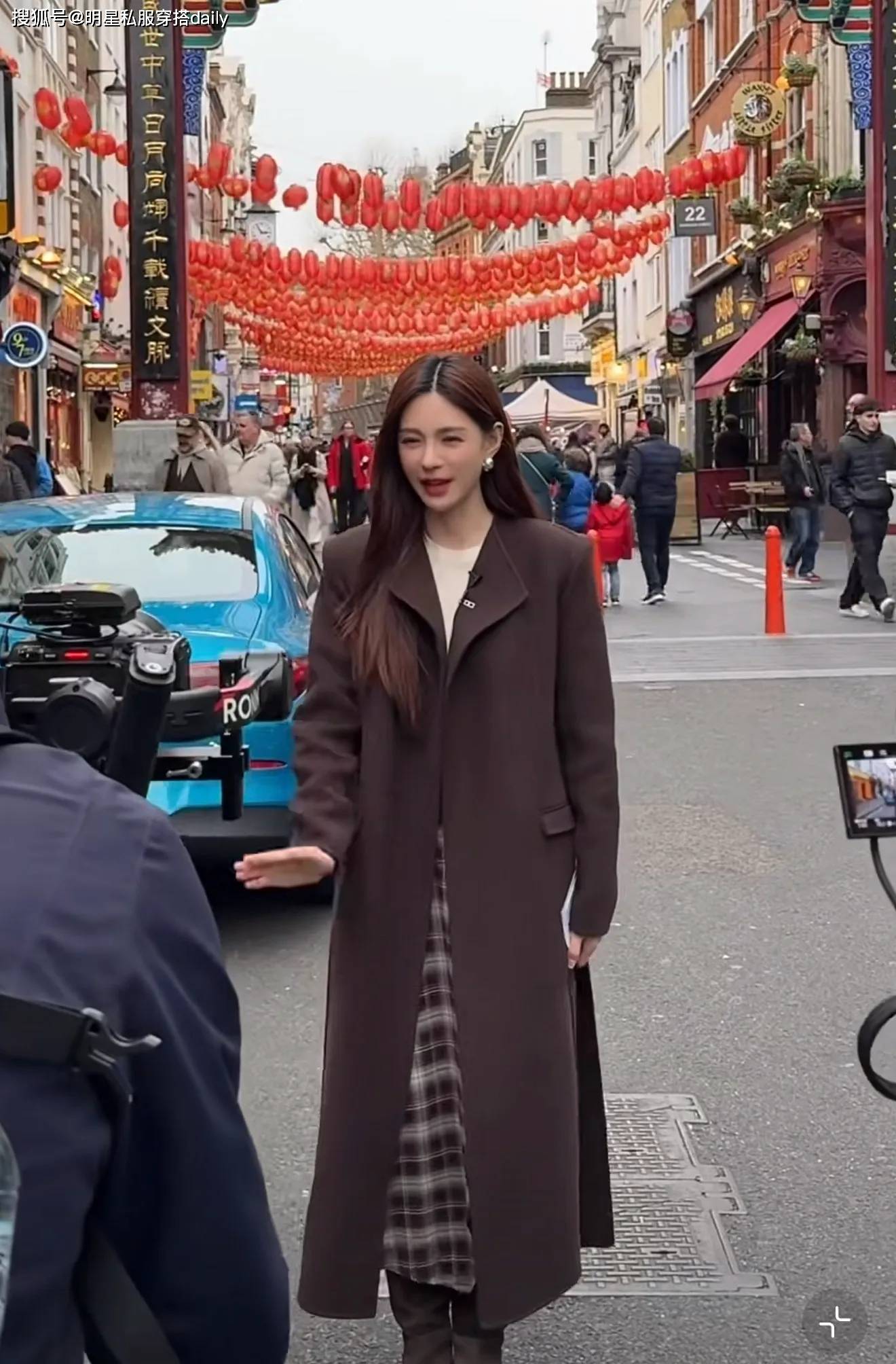 脚上依然搭配了棕色麂皮长筒靴,笑起来格外的明媚动人!除了品尝美食,她还让大家看了周围具有中国特色的装饰和店面!
