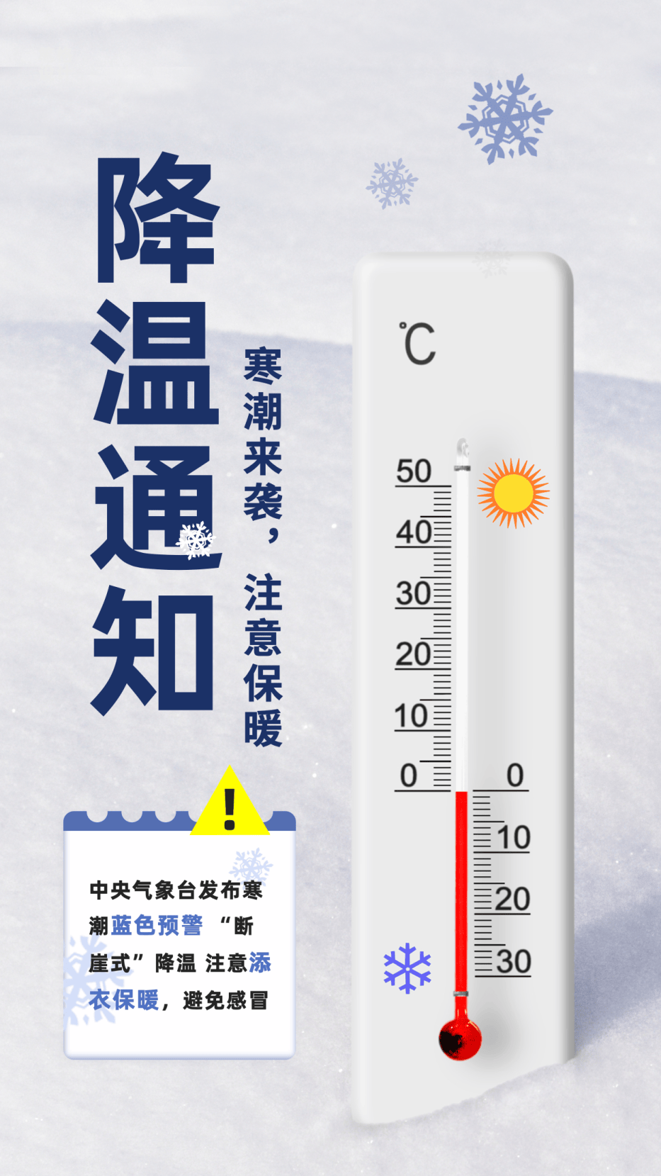 这组冬季降温提醒海报模板,采用了雪地质感背景,结合巨型温度计 + 寒潮预警标识,为降温提醒海报分享营造出强烈的视觉警示感,适合政务 / 气象类账号的降温预警发布。