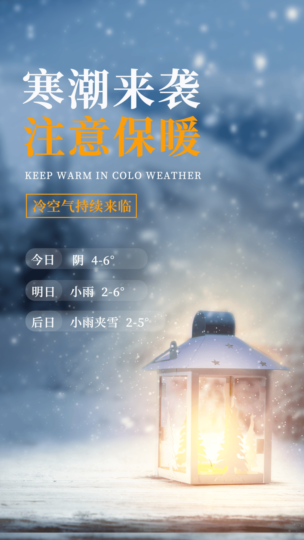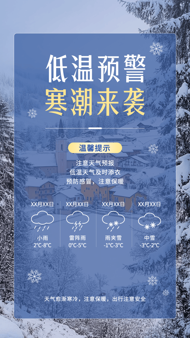 这组冬季降温提醒海报模板,采用了欧式雪景小镇背景,结合未来多日天气图标 + 简约预警文案,为降温提醒海报分享营造出静谧又不失提醒性的降温氛围,适合文旅 / 生活服务类账号的出行提示。