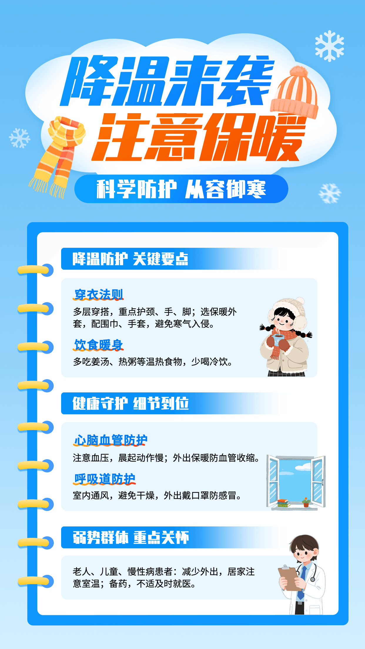 这组冬季降温提醒海报模板,采用了卡通手绘风格,结合保暖『穿搭』人物+防护要点清单,为降温提醒海报分享营造出亲切实用的科普氛围,适合学校 / 企业面向全员的健康防护通知。