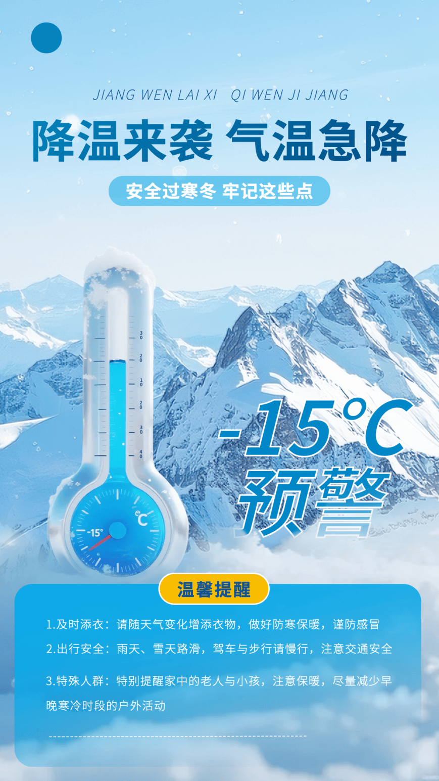 这组冬季降温提醒海报模板,采用了雪山冰川背景,结合低温温度计 +-15℃预警标识,为降温提醒海报分享营造出极具冲击力的严寒预警氛围,适合北方地区的极端天气提示。