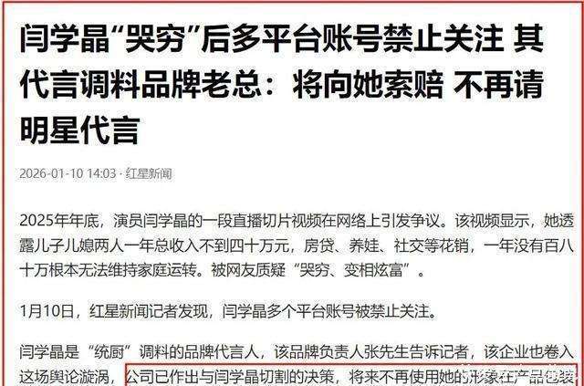 『娱乐圈』️刚刚迎来2026年,却立刻被一出令人目瞪口呆的大戏轰动了:闫学晶从直播哭穷到账号被禁关注,再到代言品牌的纷纷切割,整个剧情的反转简直比过山车还刺激,让人不禁感叹好家伙!这一连串操作堪称教科书级的翻车,而闫学晶本人,也因此迅速成为了舆论的焦点。