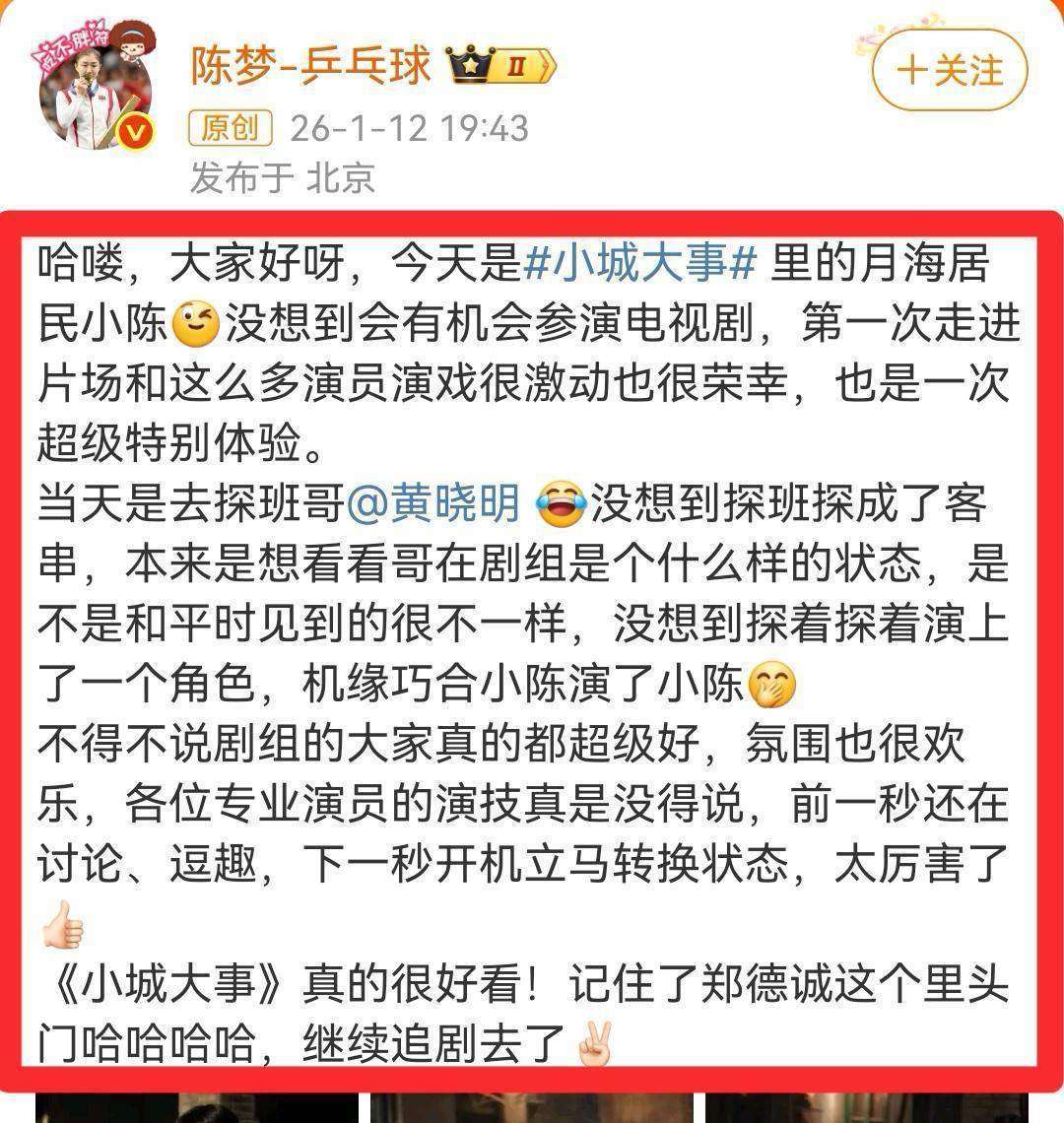 在『赵丽颖』和『黄晓明』主演的《小城大事》中,演员阵容可谓豪华到令人惊叹。即便是一些仅在剧中出现几分钟的配角,也都是大家耳熟能详的大咖。其中就有一位让人意外的演员,她便是扮演乒乓球高手小陈的陈梦——没错,就是那位备受瞩目的奥运冠军陈梦。