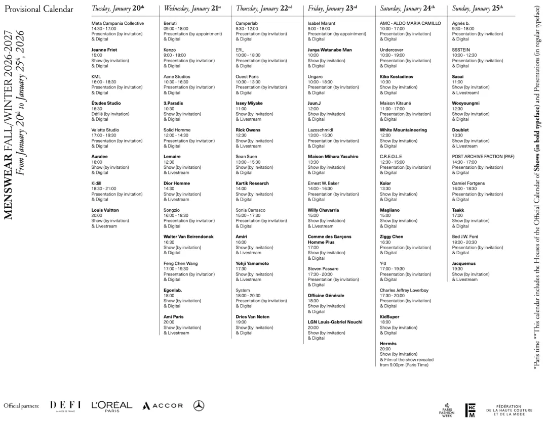 当米兰的时尚余温未散,巴黎将接过2026秋冬男装潮流的接力棒,所有目光都将转向巴黎。从2026年1月20日至25日,2026秋冬巴黎男装周将拉开序幕。届时,67个品牌将以35场时装秀和32场静态发布的形式集中亮相,全方位呈现秋冬男装系列的创意风向。本季巴黎男装周的名单中囊括了Hermès、『Dior』 Homme、Berluti、Lemaire、Kenzo、Acne Studios、Yohji Yamamoto、Comme des Garçons Homme Plus 等知名品牌。『奢侈品』牌Loewe、Lanvin,以及上季重返巴黎男装周官方日程的 Saint Laurent,则遗憾缺席本季盛会。而巴黎男装周的常客中国『『设计师』品牌』Feng Chen Wang(王逢陈)、Sean Suen(孙小峰)、Ziggy Chen(陈翔)本季将会继续参与。