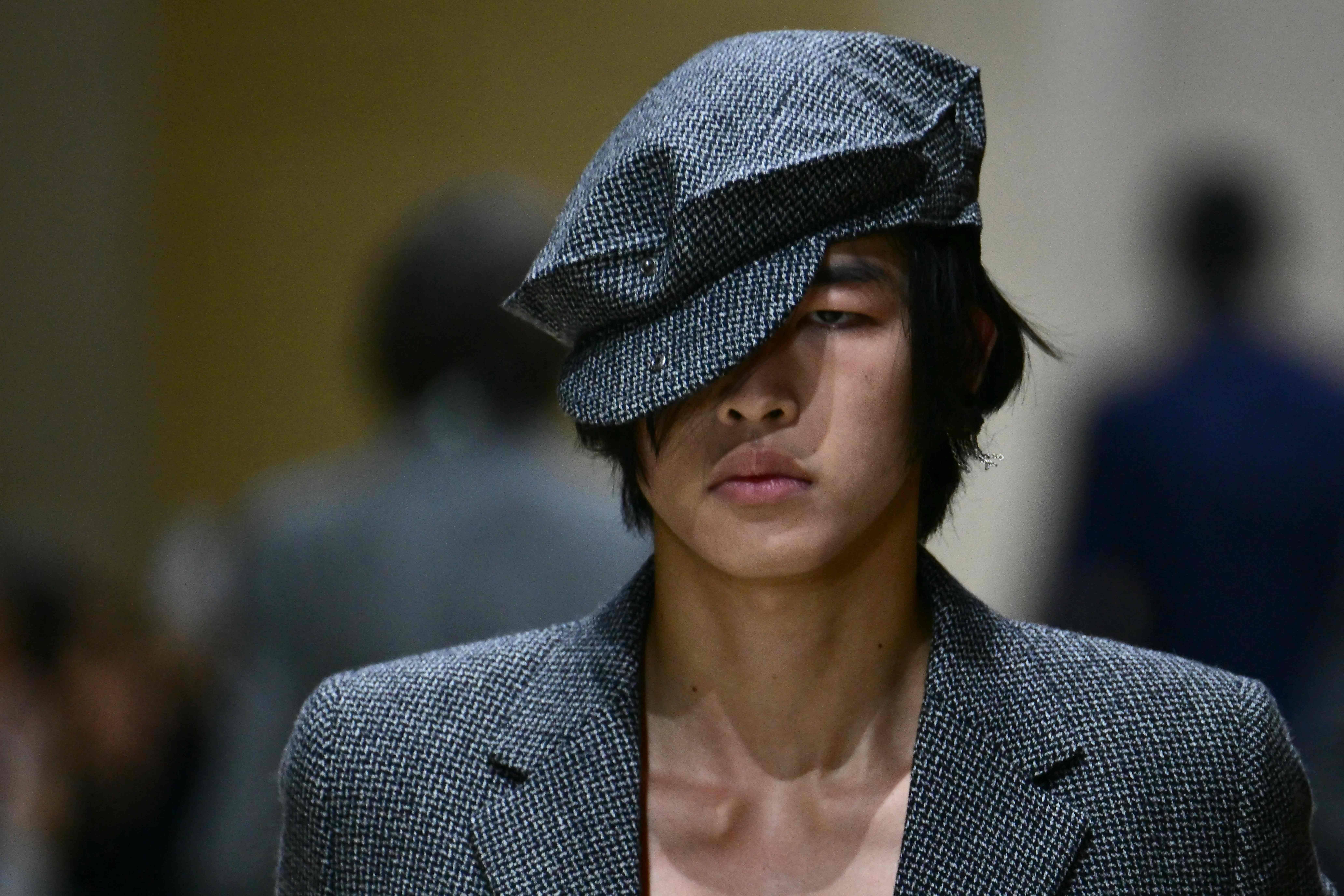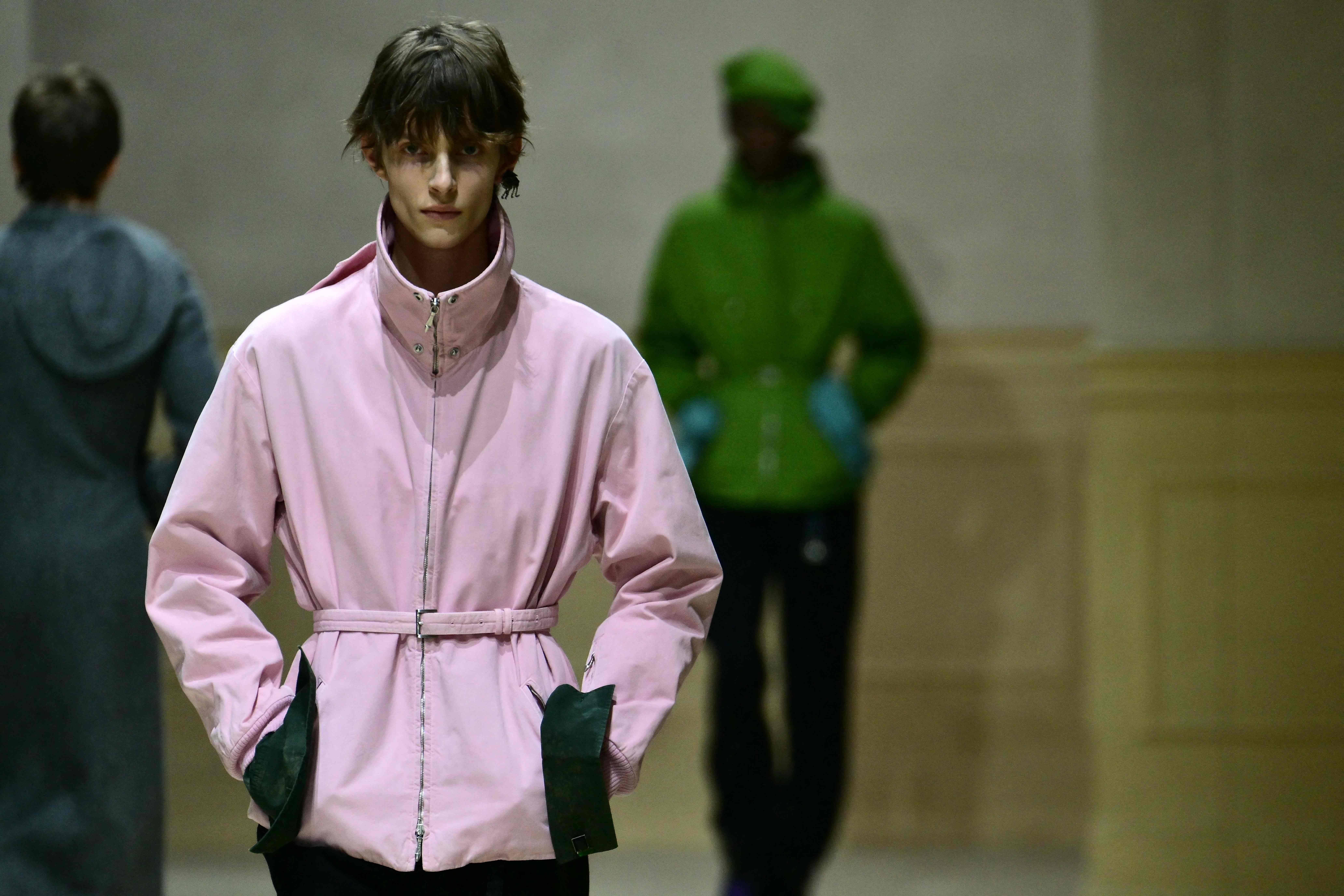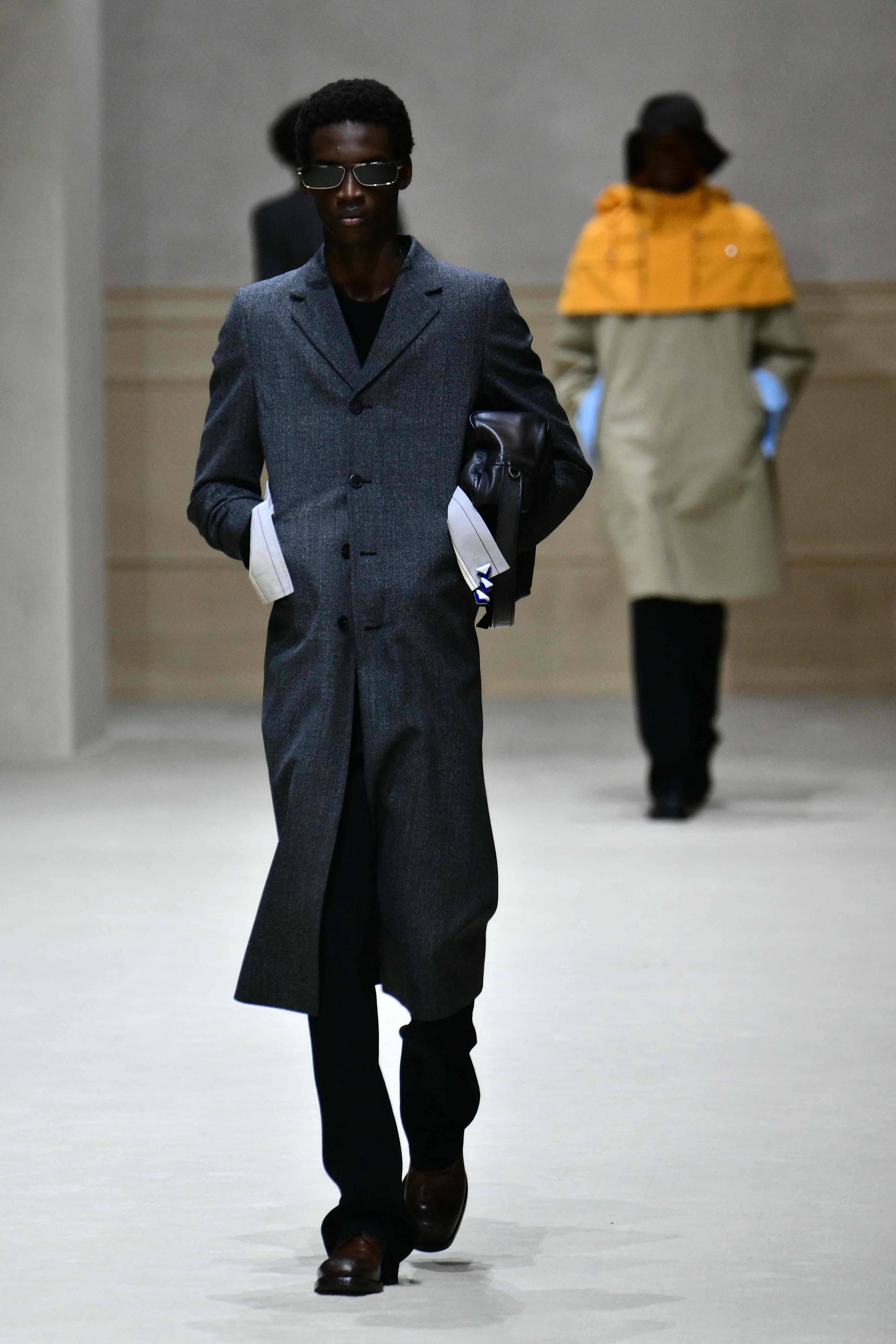 1月18日,模特在意大利米兰男装周上展示普拉达品牌的新品时装。 今日霍州/法新
