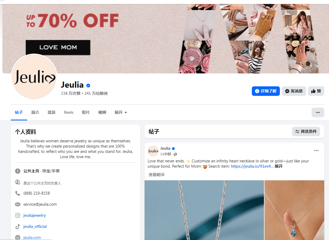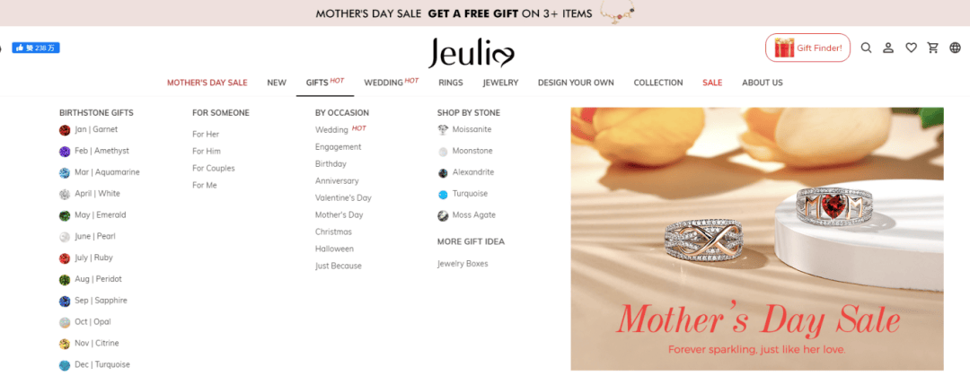 Jeulia同时布局着多个社媒渠道,重点布局的社媒渠道是Facebook,Jeulia主要的社媒流量都来自于Facebook,目前Jeulia在Facebook的官方账号的点赞量累计已经达到了238万。