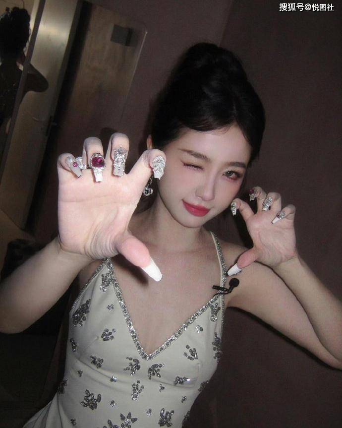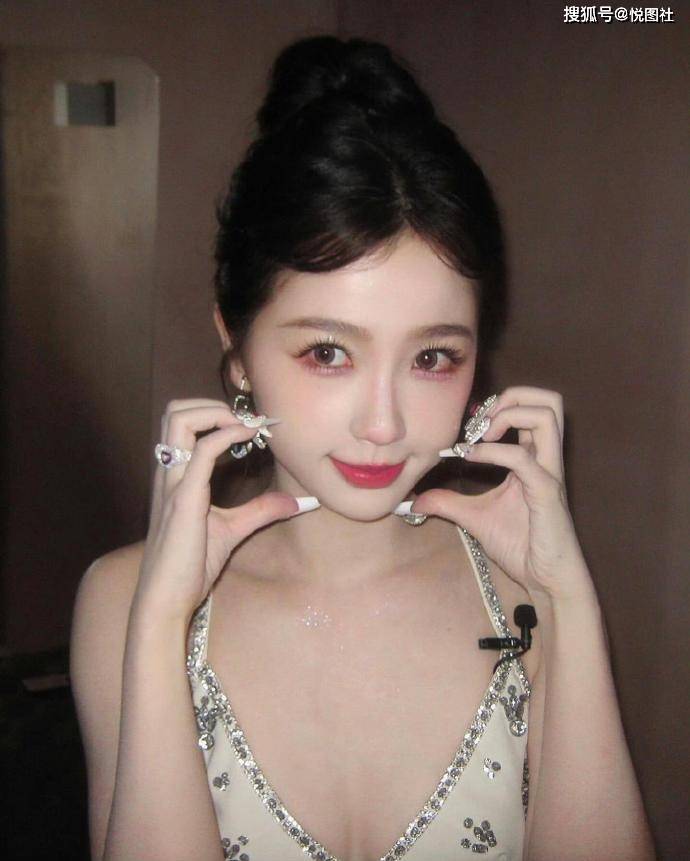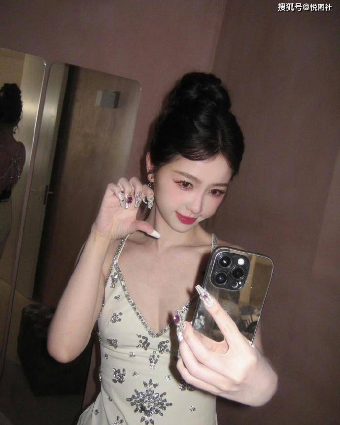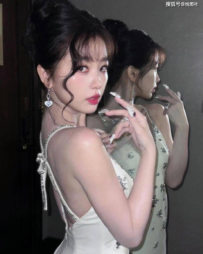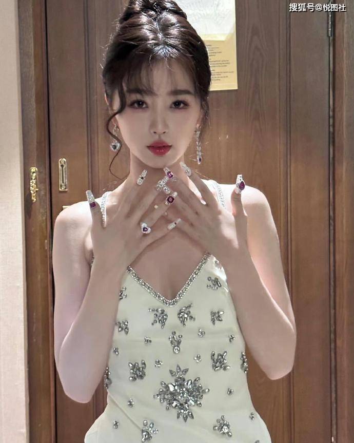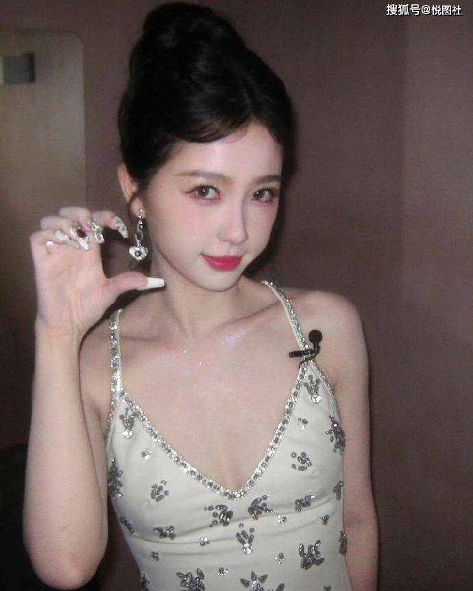 - 碎钻星光吊带裙:作为造型核心,米白缎面裙身点缀满幅碎钻花纹,如同将星子凝于衣身,在暖光下折射出细碎光泽。V 领设计自然露出肩颈线条,露背剪裁与蝴蝶结🎀绑带强化了柔美元💵素,修身版型勾勒出柔美身形比例,让清甜在华贵中更具张力。
