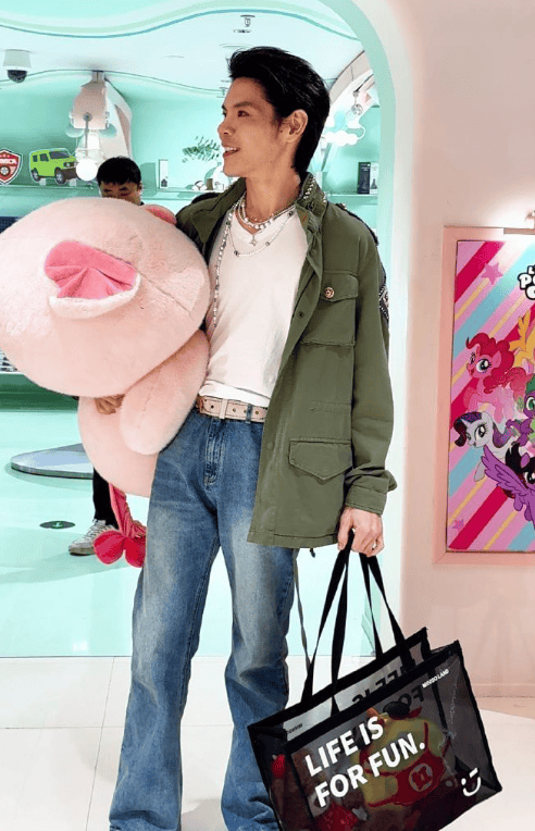 除了巨型猪公仔这个吸睛焦点,他的整体状态也让人眼前一亮。没有穿以往被吐槽“抽象”的花衬衫、亮片装,而是一身浅蓝立领长袖搭配米白休闲裤,清爽利落的『穿搭』衬得身形挺拔,完全褪去了豪门子弟的浮夸感。