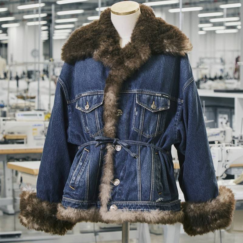 在2025秋冬系列中,杜嘉班纳以一种全新的视角解读了经典的牛仔夹克。牛仔布独有的粗犷纹理,在超大廓形的夹克中愈发凸显,石洗工艺赋予其一种复古做旧的质感,仿佛承载着岁月的痕迹。局部点缀的细微磨损设计,更添一丝不羁的韵味,彰显出DG品牌不拘一格的时尚态度。而Dolce&Gabbana的巧思则体现在其内衬的选择上——柔软的羊绒内衬与绗缝袖子形成精致的对比,不仅在视觉上增添了层次感,更带来了包裹式的舒适体验。侧边抽绳设计,则赋予了穿着者极大的自由度,可以根据个人喜好和搭配需求,自由调整夹克的宽松廓形,完美平衡了休闲风格与精致细节。
