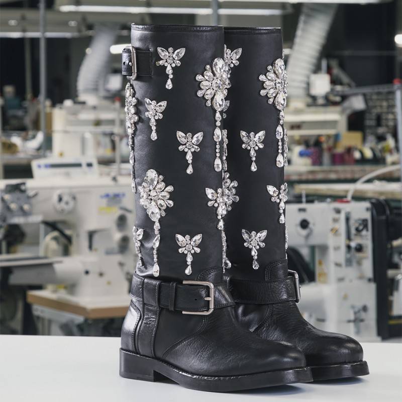 在杜嘉班纳2025秋冬系列的纳帕皮靴上,品牌基因中的对比美学得到了淋漓尽致的展现。珍贵的手工刺绣,呈现出璀璨的光泽,如同一件件精美的胸针,镶嵌在靴面上。模块化的棋盘格图案,由框架式纹样构成,这种精巧的设计,为整双靴子增添了艺术感。DG品牌将华丽典雅的装饰元素与休闲随性的廓形巧妙地融合在一起,形成鲜明的视觉碰撞。这种强烈的对比,不仅没有显得突兀,反而创造出一种极具吸引力的视觉效果,让D&G这款皮靴充满了独特的个性和时尚感。