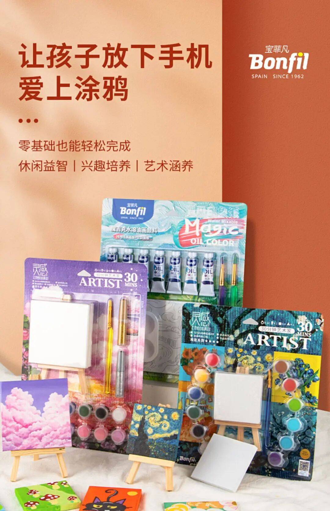 给孩子的满分礼物🎁来啦~源自西班牙的“儿童色彩专家”Bonfil宝菲凡品牌儿童绘画材料净味丙烯、宝菲凡儿童速干水粉颜料套装、小布丁手指画颜料等,是江苏宝菲凡儿童用品有限公司的『明星』️产品,颜值与内涵双在线,安全且有趣;Bonfil宝菲凡超轻粘土套装等手工类产品,材料丰富,创意无限。