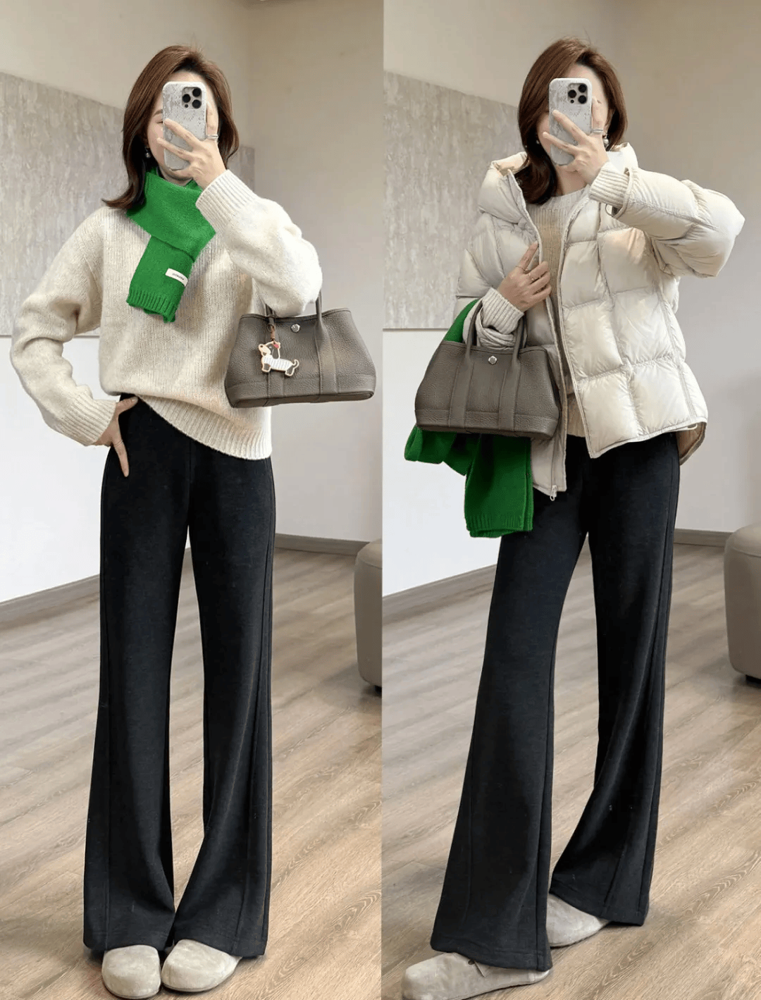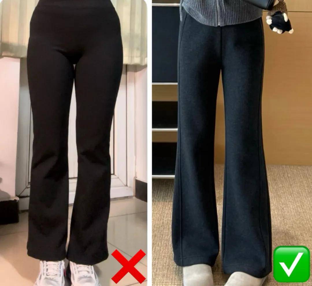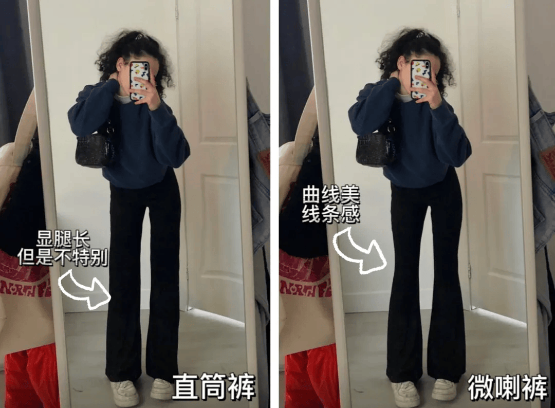 前面说过,版型裁剪一差,上身反胖10斤,你看右边版型好的微喇阔腿裤,修饰腿型能力就比左边强,显得腿更瘦:
