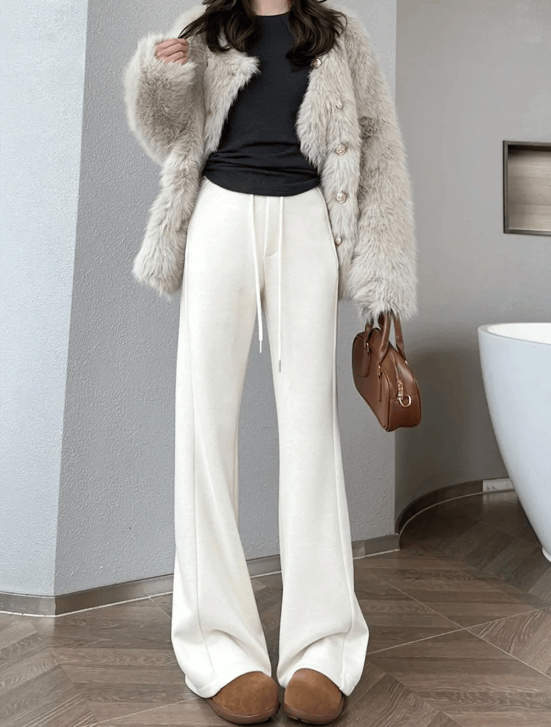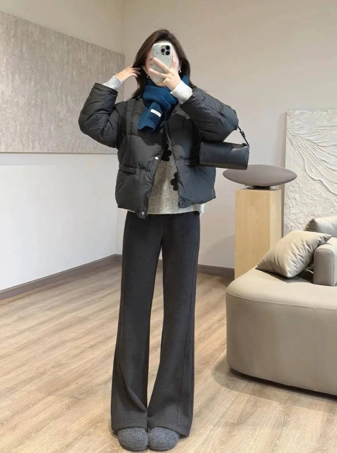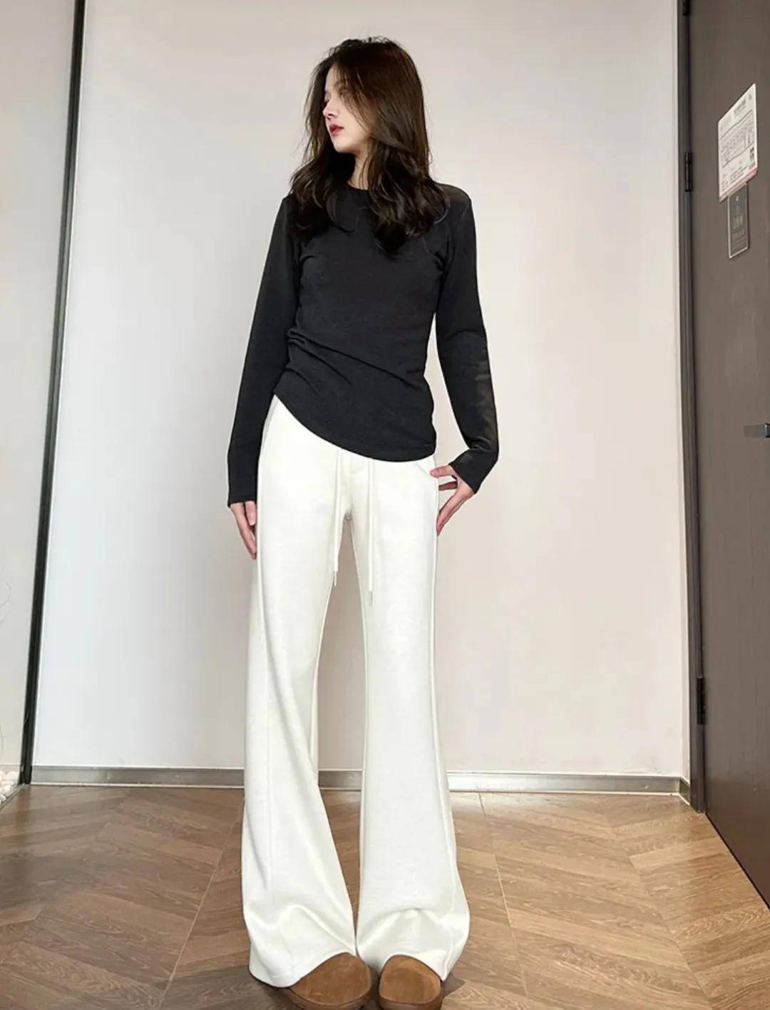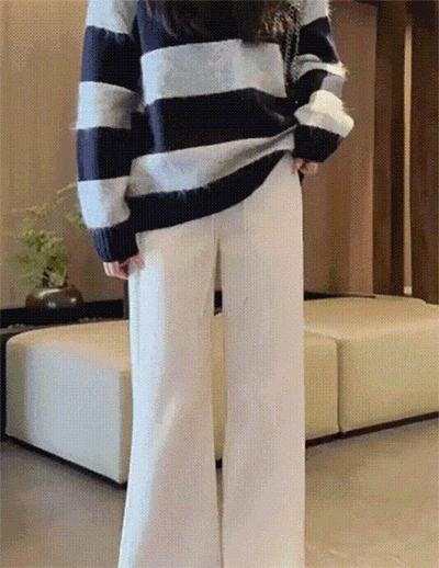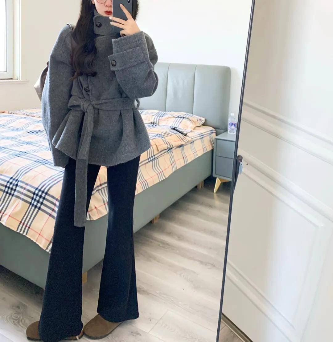 这条绵羊毛微喇裤上身之后,把腿遮挡得严严实实,双腿看起来直了不少。