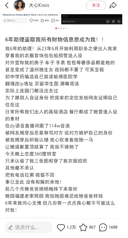 我本以为只是盗图,结果,这个女助理不仅盗用她的『奢侈品』服饰、包包、首饰。
