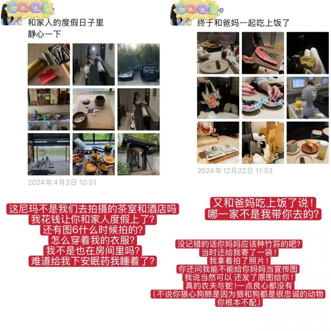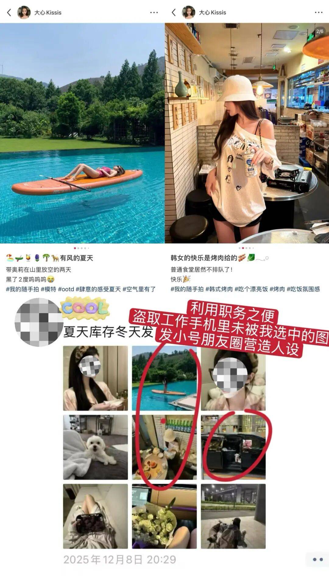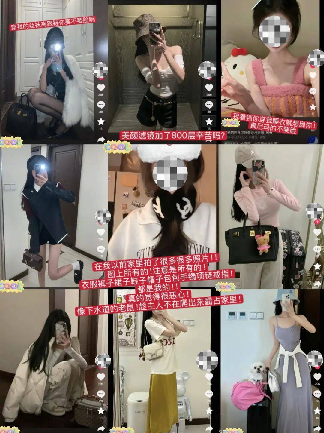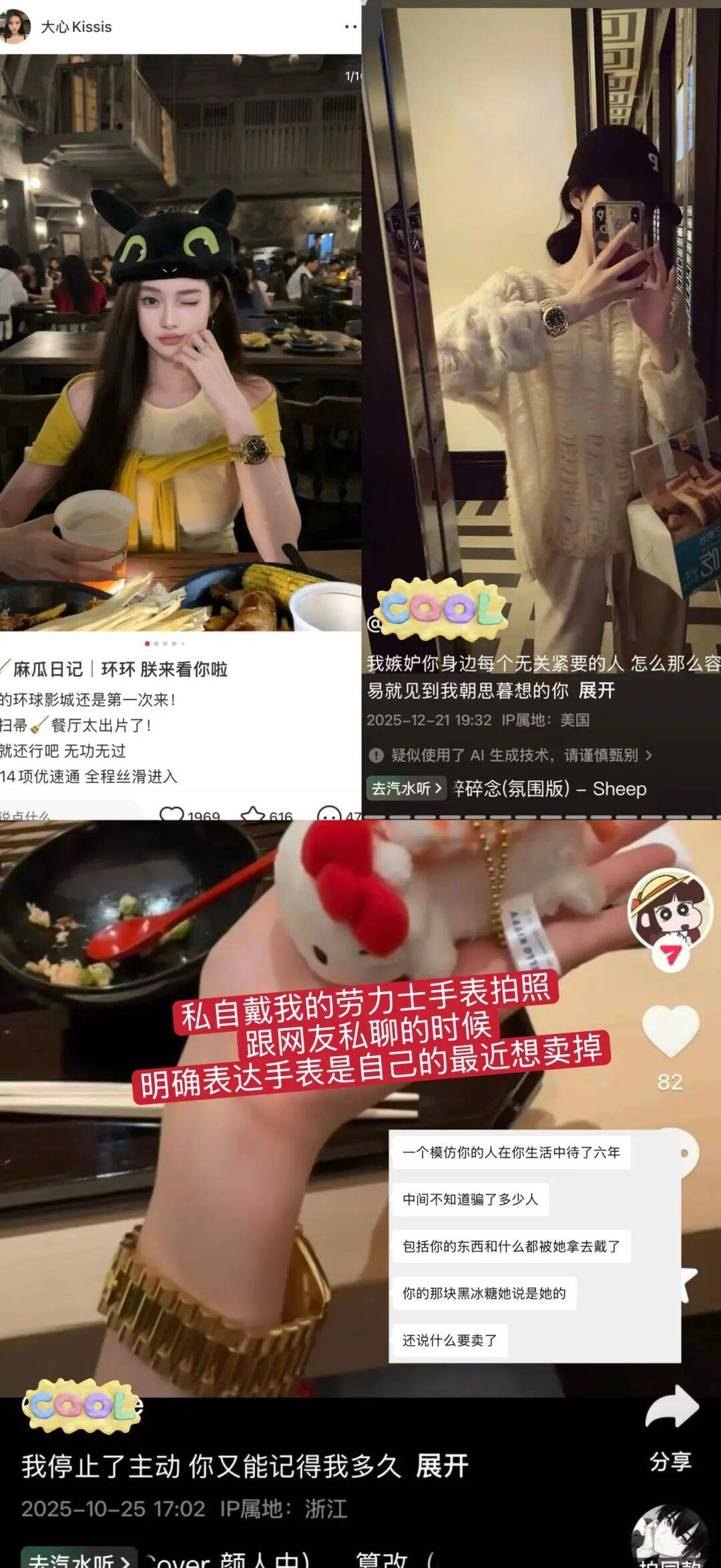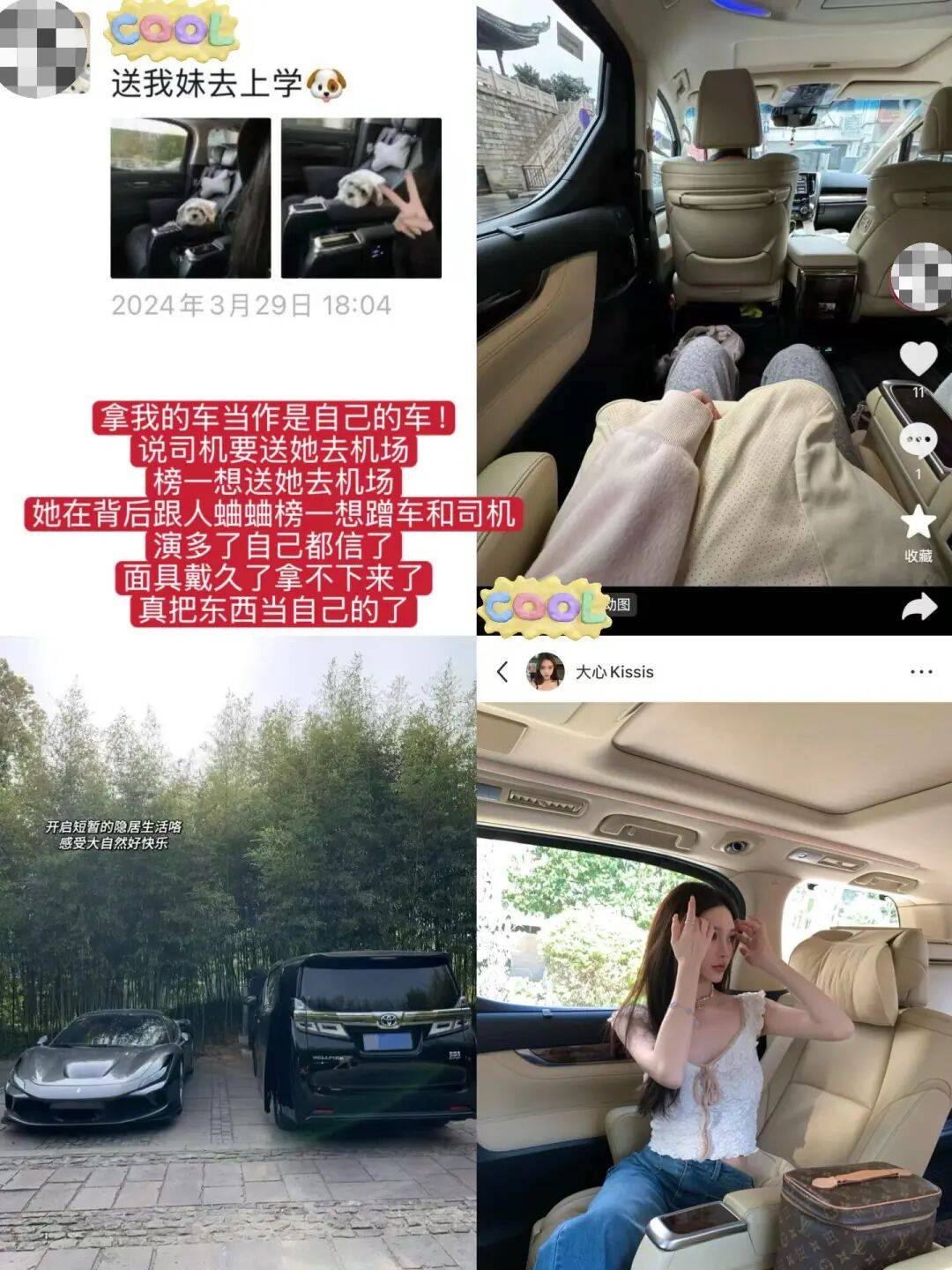 还有她发的九宫格照片,全是偷穿@大心Kissis 的衣服、背她的包包、戴她的手镯项链戒指💍,没有一样东西是她自己的。