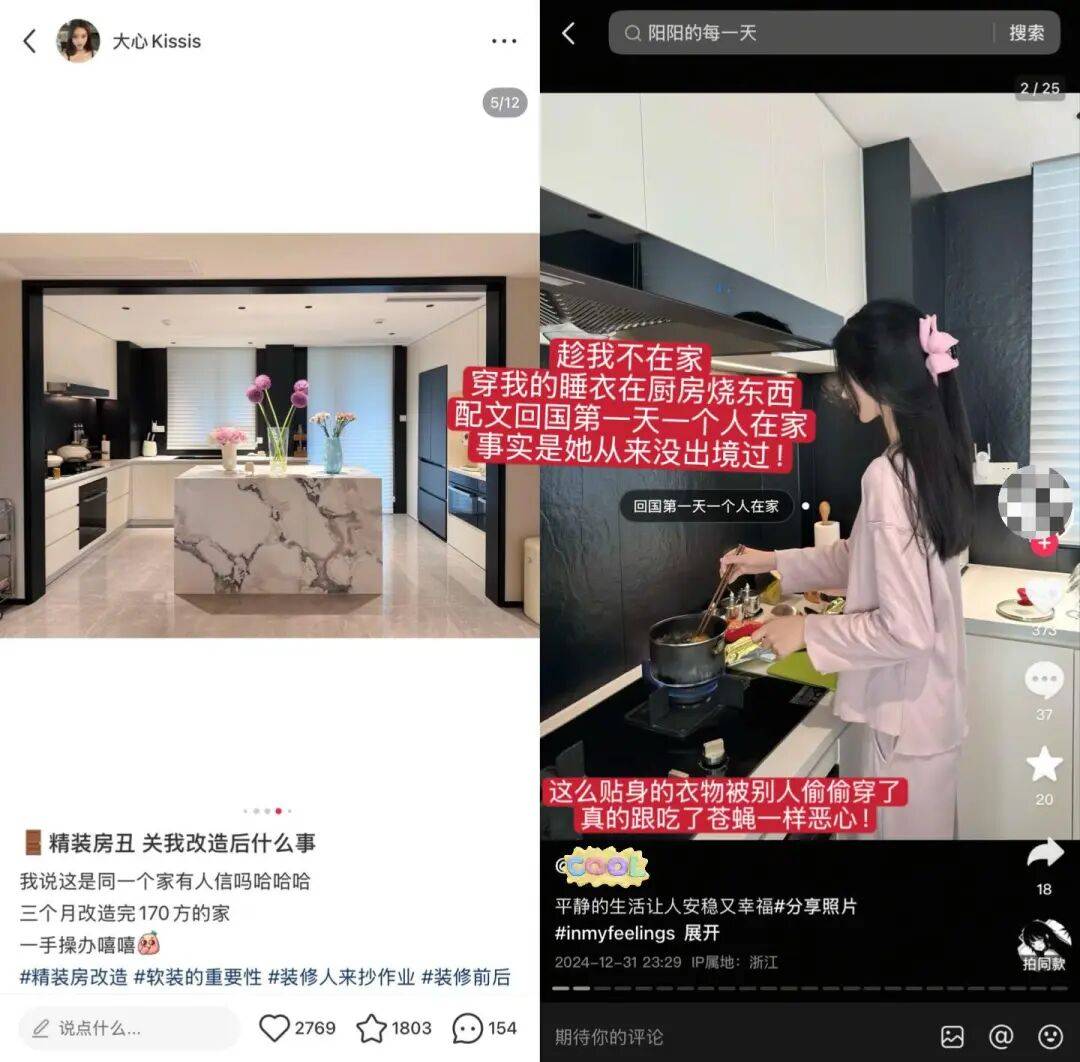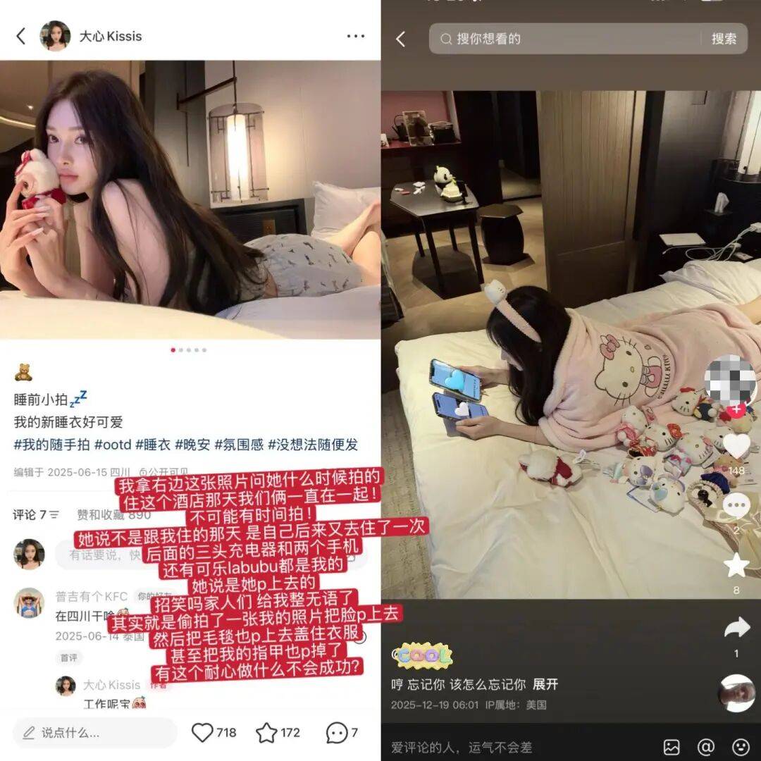 就在前段时间,有热心网友私信@大心Kissis,说有人在网上盗用她的照片行骗,而且骗得有模有样,最离谱的是,那个骗子穿的睡衣、戴的发夹,就连拍摄地点,都是她家里的厨房!
