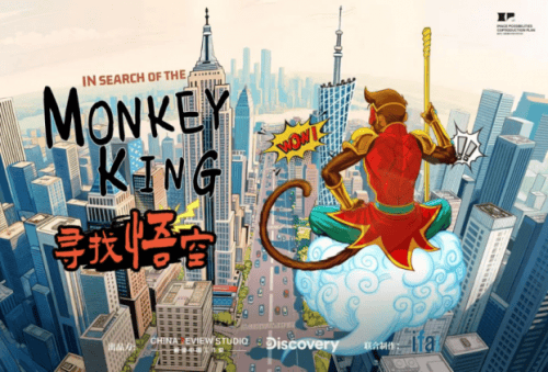 美漫悟空+水墨背景,悟空面具与纽约天际线并置,体现中西文化对话的创意表达。