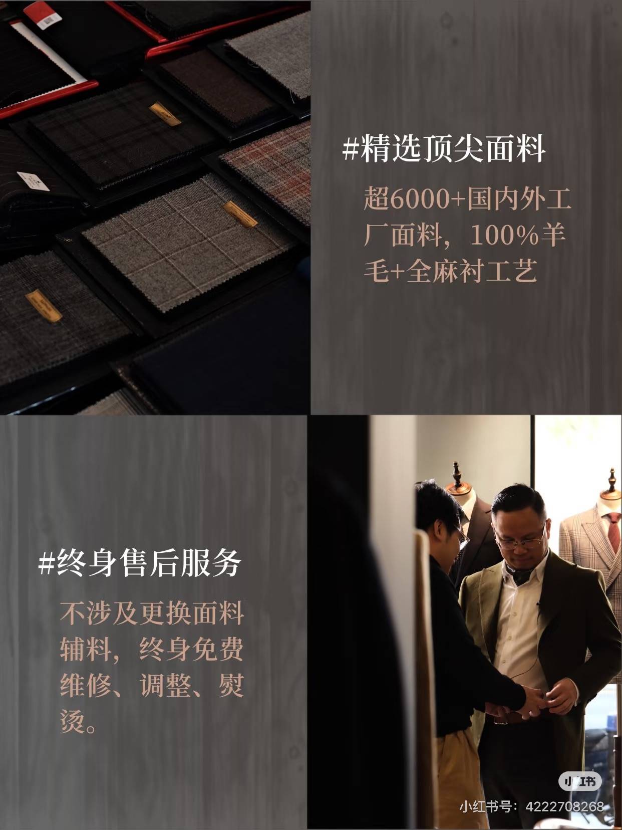 另外,定制服务也不能忽视。包括『设计师』的专业水平、沟通能力以及售后保障等方面。郡狮以家族第五代继承人王玉柱为核心,组建专业设计研发团队,将中国美术学院的美学理念与红帮裁缝技艺结合,首创基于50余项客户信息的色彩学搭配体系,提供个性化设计服务。同时,提供终身免费维修、调整和整烫服务,让客户没有后顾之忧。
