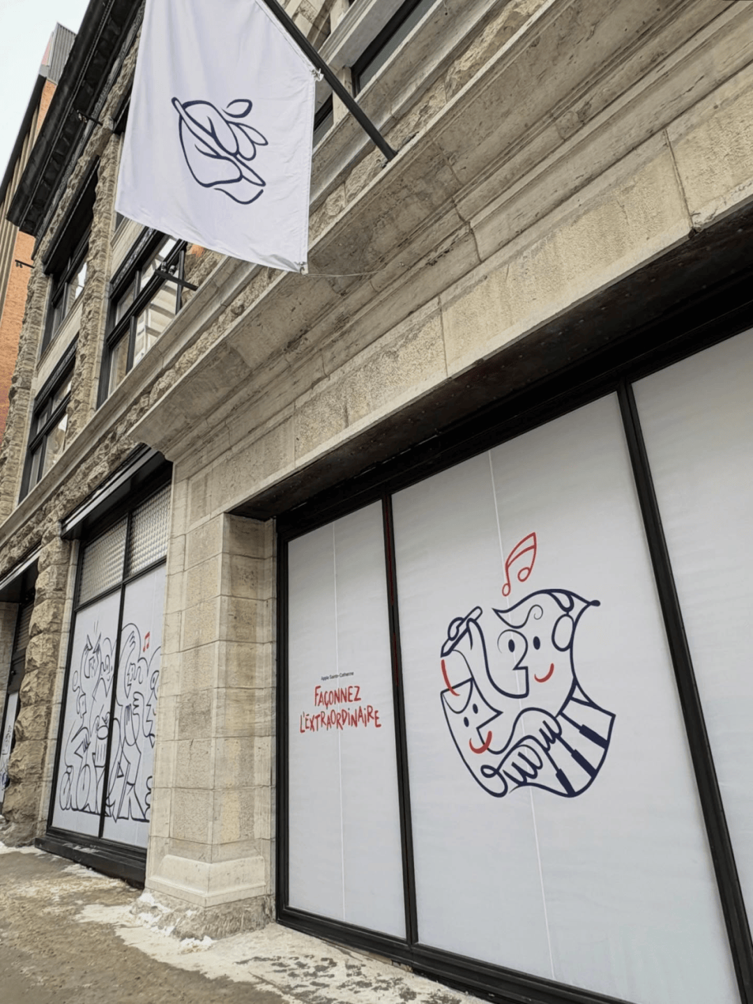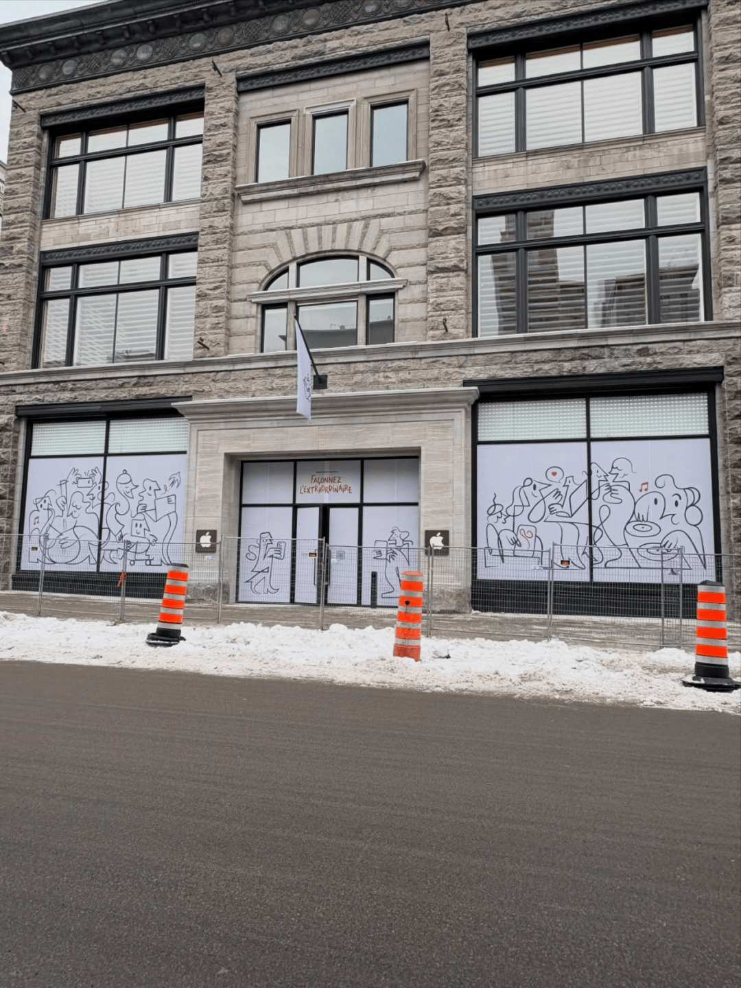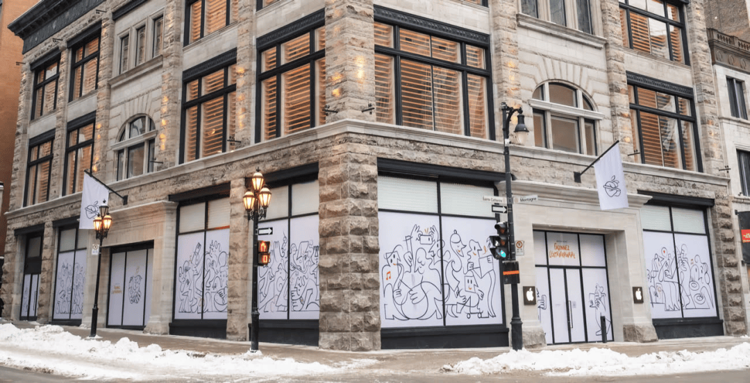 最近,苹果在加拿大蒙特利尔的新店,与本地艺术家联合推出新店LOGO设计。