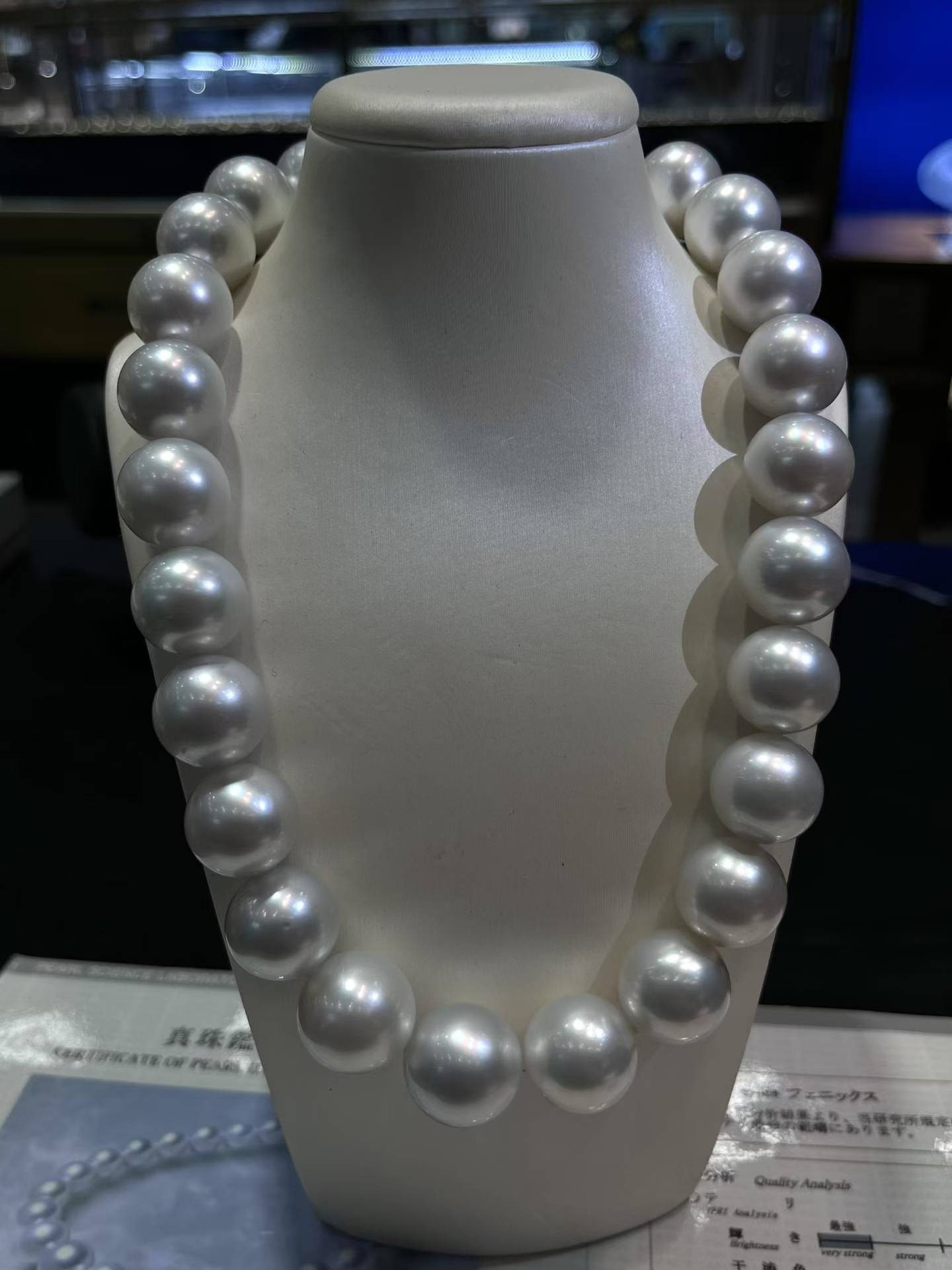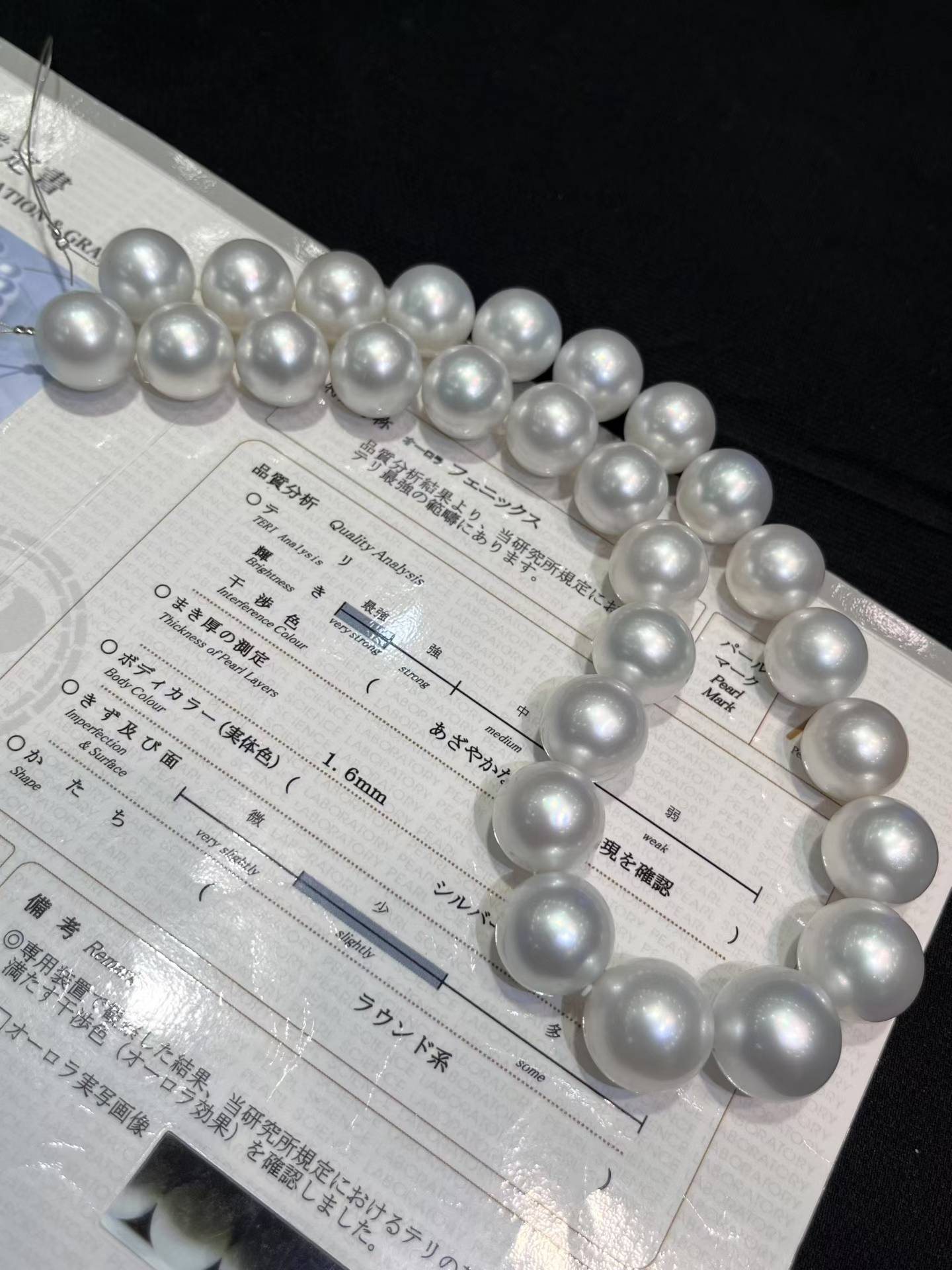 真科研“凤凰”认证澳白项链,16-18mm大点位冷银珠光,1.6mm厚珠层自带极光感,顶级评级加持,既是珠宝也是传家藏品。