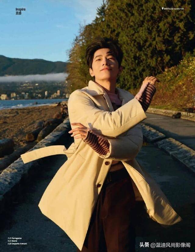 封面取景于温哥华斯坦利公园的海边黄昏,暖金落日漫过海面,将云层与沙滩晕成温柔的色调,他身着暖调大衣立在海风里,衣摆被风拂出轻柔的弧度,发丝沾着落日的柔光,没有刻意张扬的姿态,只是眉眼舒展地望向远方,把旅行的松弛与岁月的温润,尽数揉进这帧封面里。没有繁复的造型堆砌,没有浓烈的妆造修饰,贴合《悦游》旅行与自然的内核,用最舒展的状态,拍出了属于开年最治愈的时尚模样。