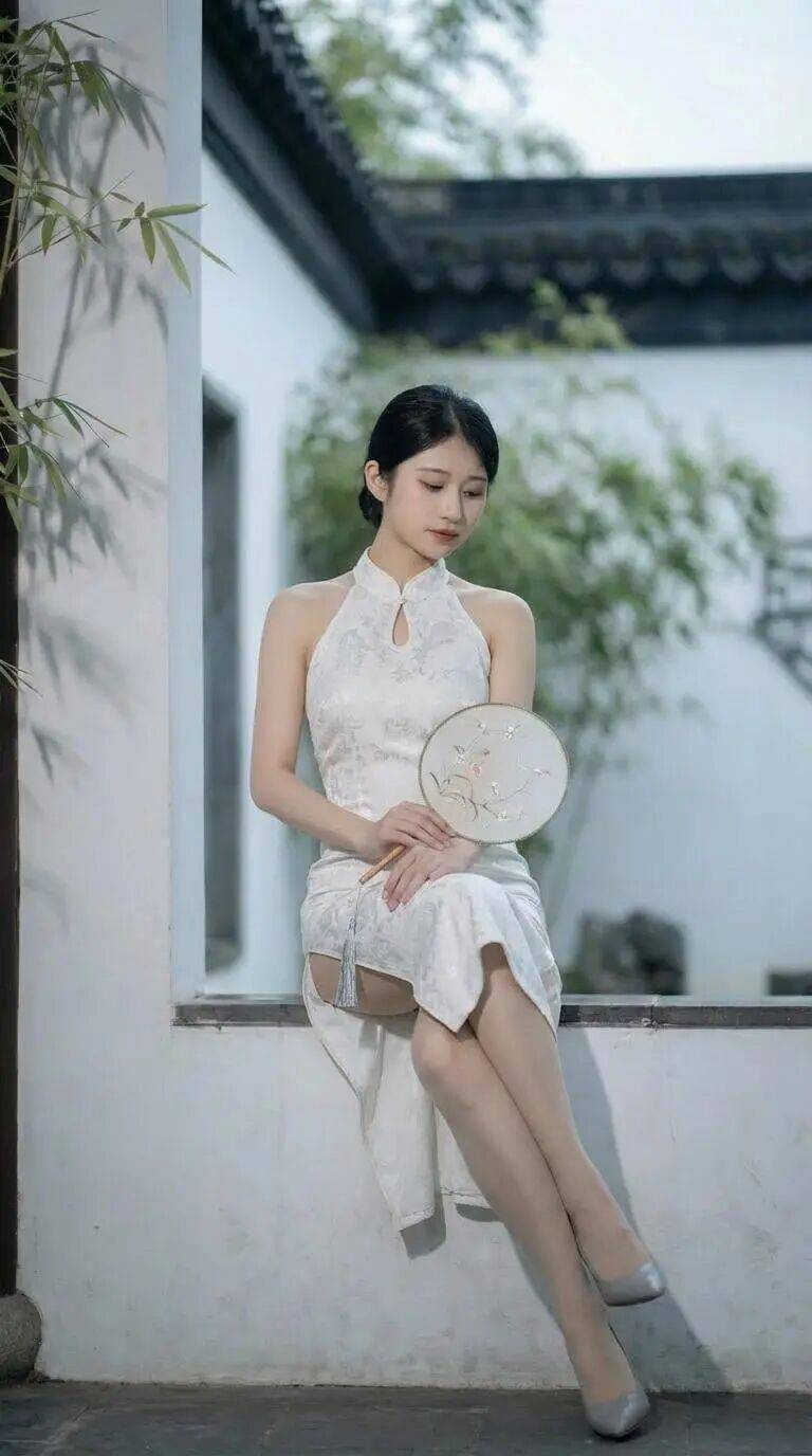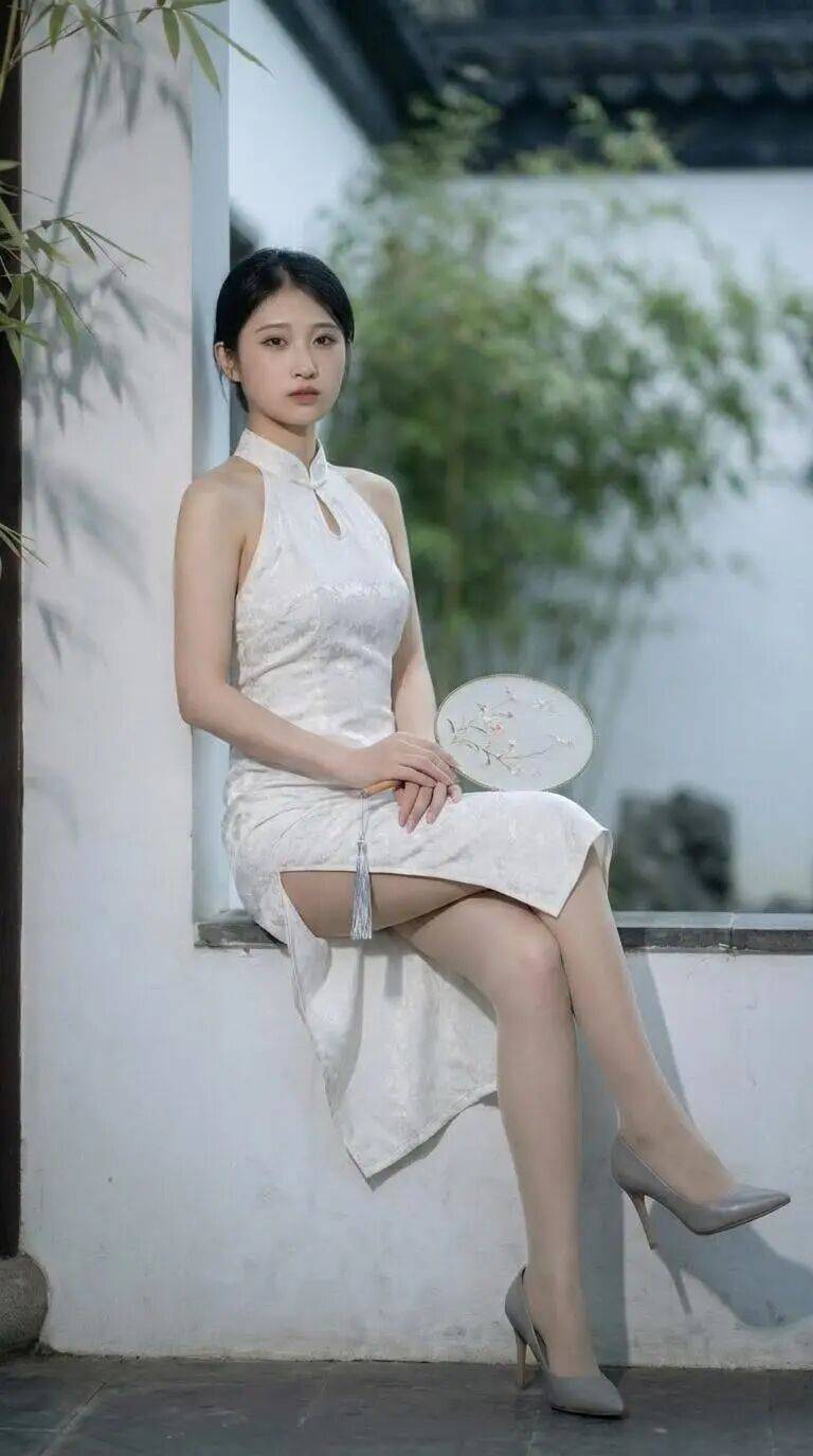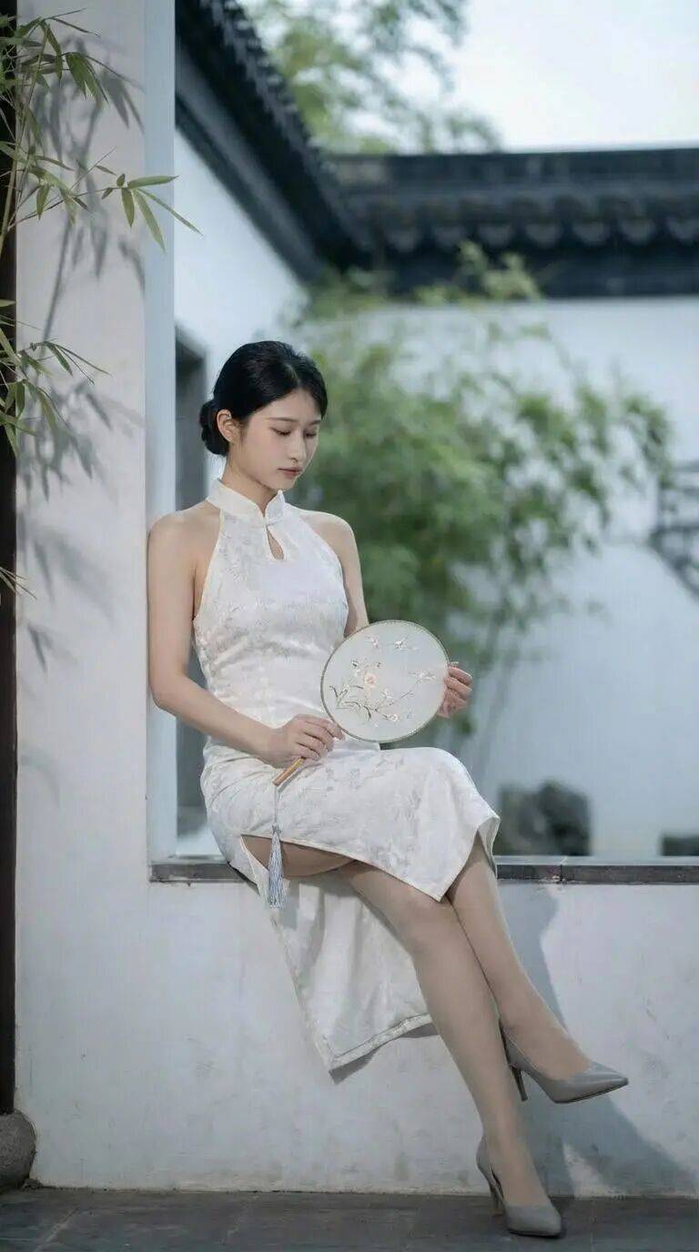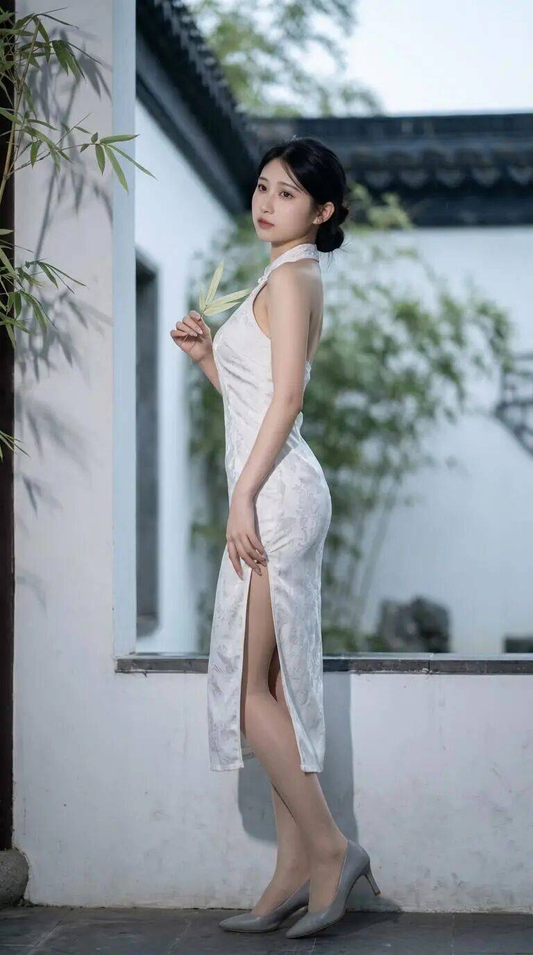 5.这张是利用 “光影” 做层次的典型。模特的上半身被竹影投下斑驳的纹路,和旗袍的暗纹形成呼应,让白色的衣服不再单调。特意让一只脚搭在半空,而不是双脚都放在地面,这样下半身的线条更舒展,也让画面多了一点随性的气质。如果双脚都着地,就会变成拘谨的坐姿,少了这份慵懒的美感。