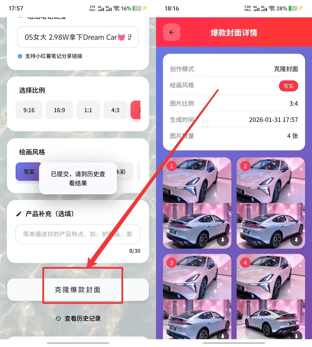 点击「克隆爆款封面」,系统会生成4张风格统一的封面图,比如克隆汽车类爆款封面,会生成不同角度的写实效果图,色彩和质感完全还原原作,直接下载就能用在笔记里,大幅提升点击率!