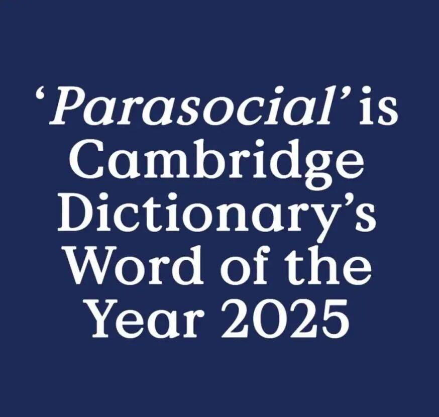 2025年12月,剑桥词典将“parasocial”选为2025年年度词汇.这个词可以翻译成“单向度社交”或“神交”,形容人们对并不认识的对象(如网红、『明星』️、虚拟角色、AI)产生情感联系。