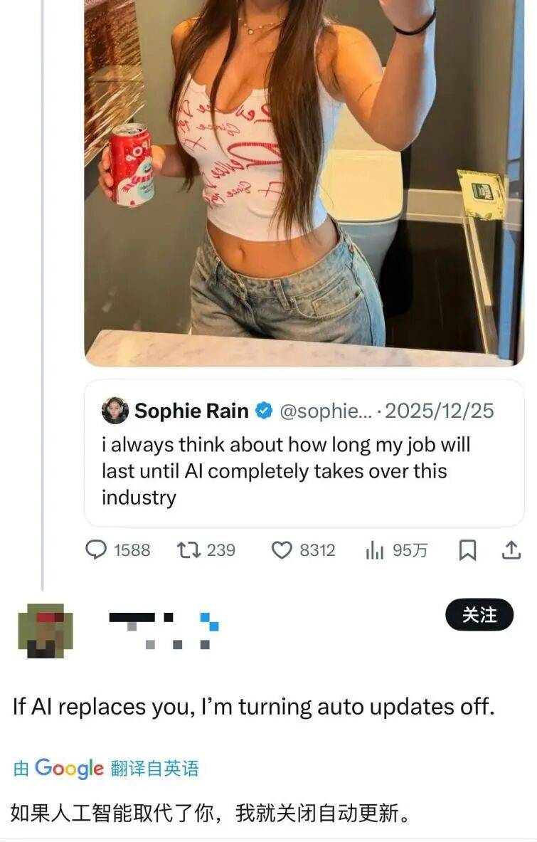 2025年12月25日,索菲更新了自拍🤳,问粉丝:“could AI replace me?(AI会替代我吗?)”而她的粉丝在评论里写道:“如果人工智能取代了你,我就关闭自动更新。”