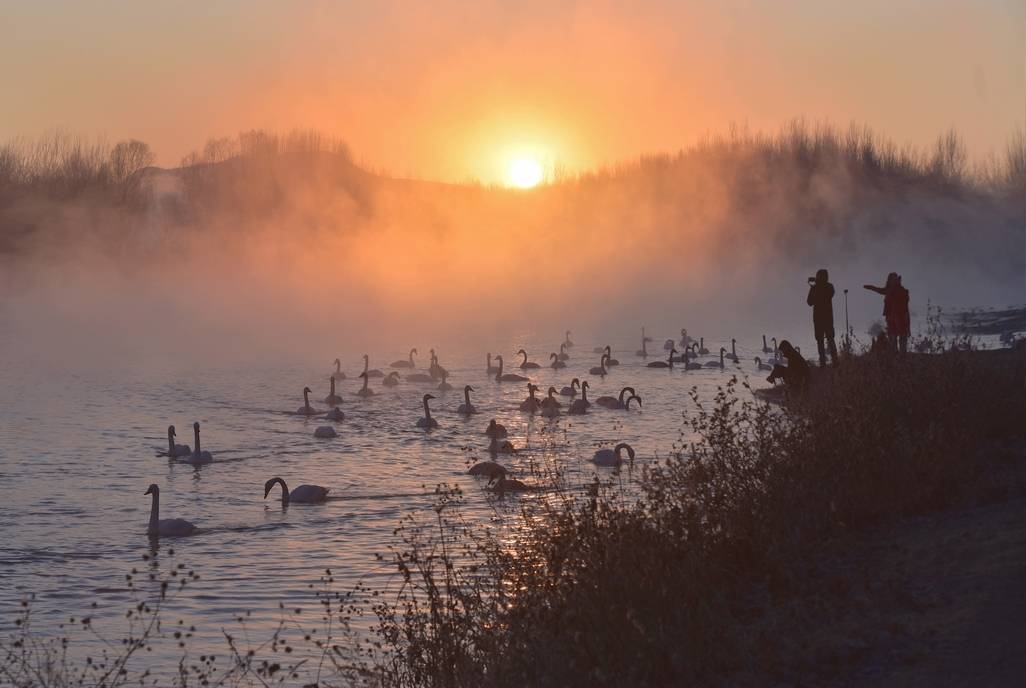 评语:这张照片采用逆光拍摄,低角度的太阳形成强烈的轮廓光,勾勒出天鹅与人物的剪影,同时给水面镀上暖金色调。晨雾作为前景层次,营造出丰富的空气透视感,增强了画面纵深感。动静结合的构图中,天鹅群的动态线条与人物静态剪影形成视觉平衡,暖调色彩统一且富有氛围感,属于典型的生态风光摄影佳作。