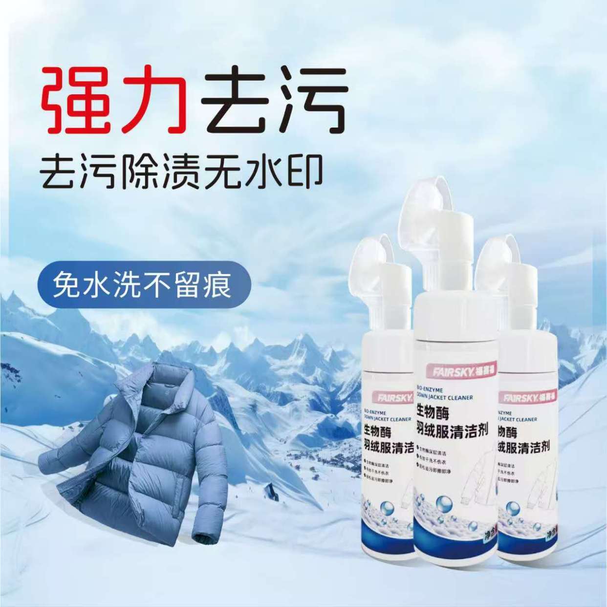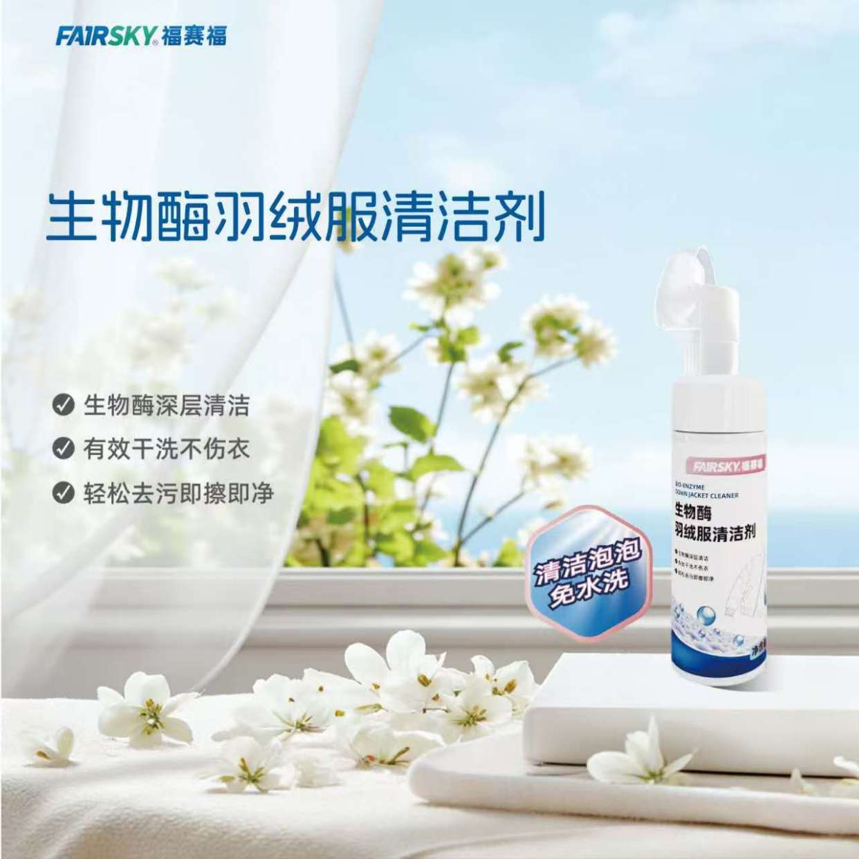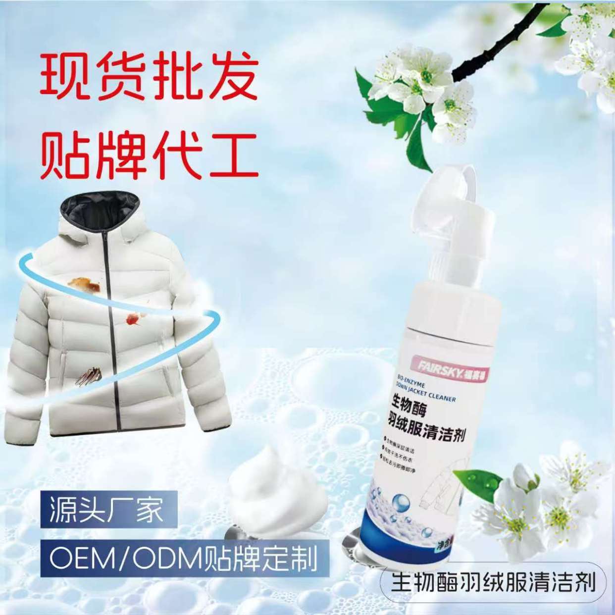 福赛生物推出的生物酶羽绒服清洁剂,核心优势在于成分的科学性。它以表面活性剂搭配FS复合生物酶为核心,生物酶作为“天然分解剂”,能精准锁定油渍、汗渍等有机污渍,将其分解为易擦拭的小分子,无需暴力搓洗就能轻松去除,从根源上减少对面料和羽绒的损伤。同时添加的护绒因子,能在清洁过程中滋养羽绒,保持其蓬松度,让羽绒服洗完后依然保暖有型;搭配去离子水和温和助溶剂,质地温和无刺激,不仅对衣物友好,也不会损伤手部皮肤。