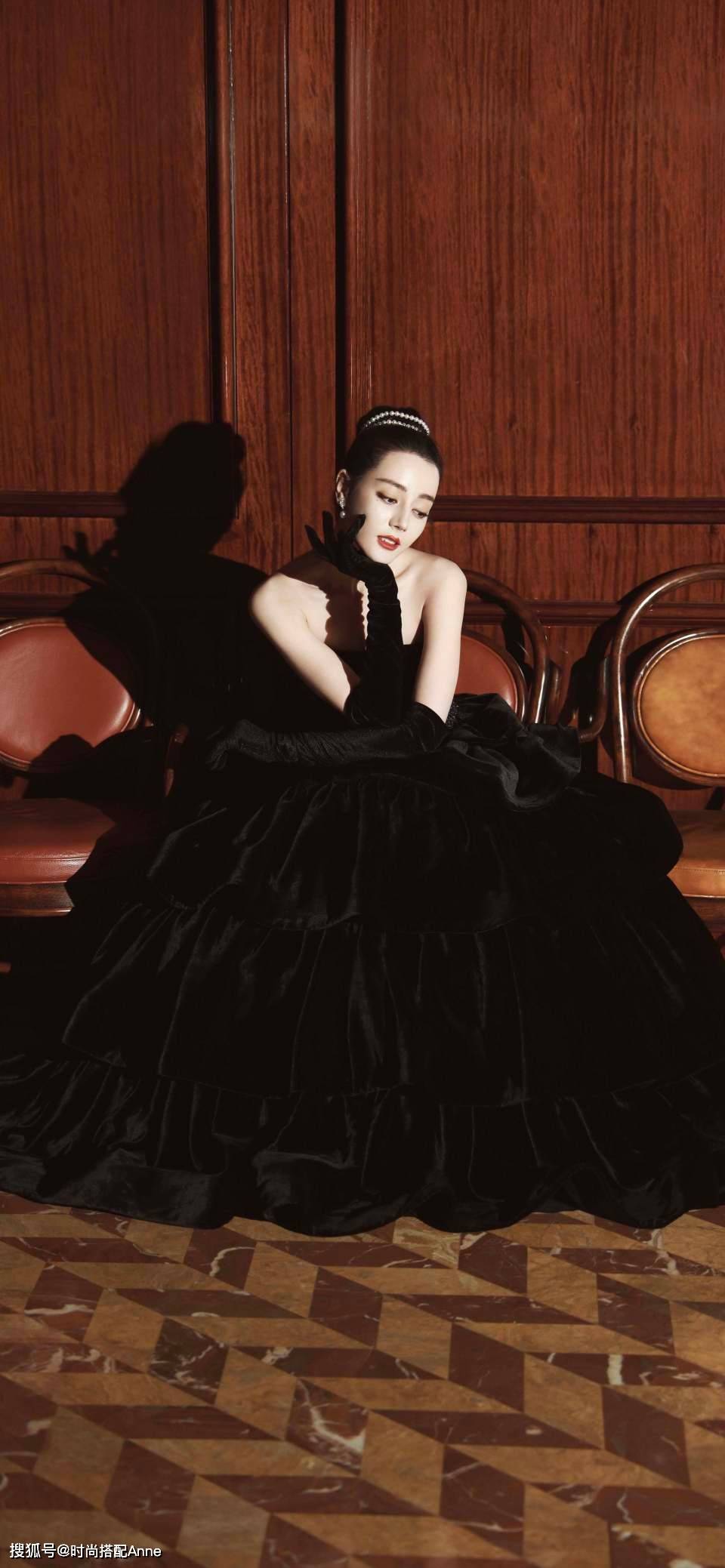 在红棕木质墙板与几何拼花地板的衬托下,她像一幅被精心装裱的古典油画。蓬松的黑色丝绒裙摆如墨色『云朵』般铺陈开来,与利落的抹胸剪裁形成鲜明对比。她微微垂眸,指尖轻抵下颌,长手套🧤的丝绒光泽顺着手臂延伸,在光影里漾开细腻的波纹。