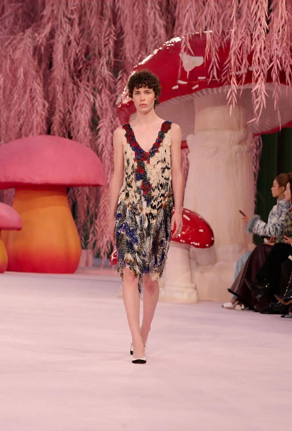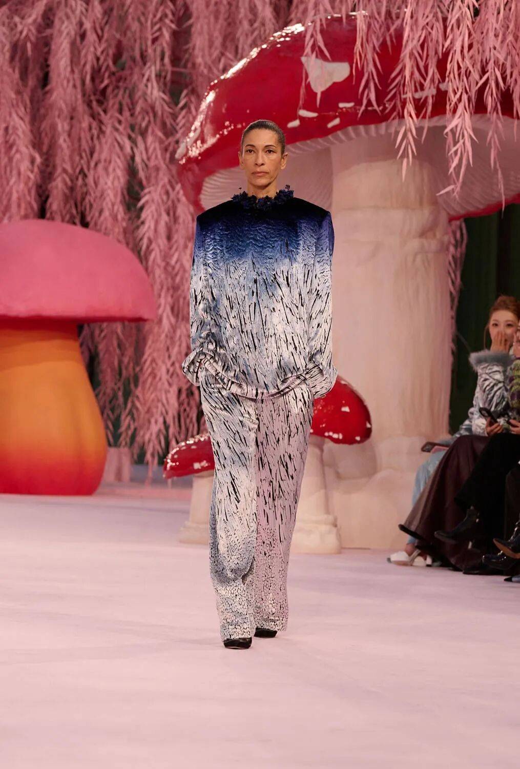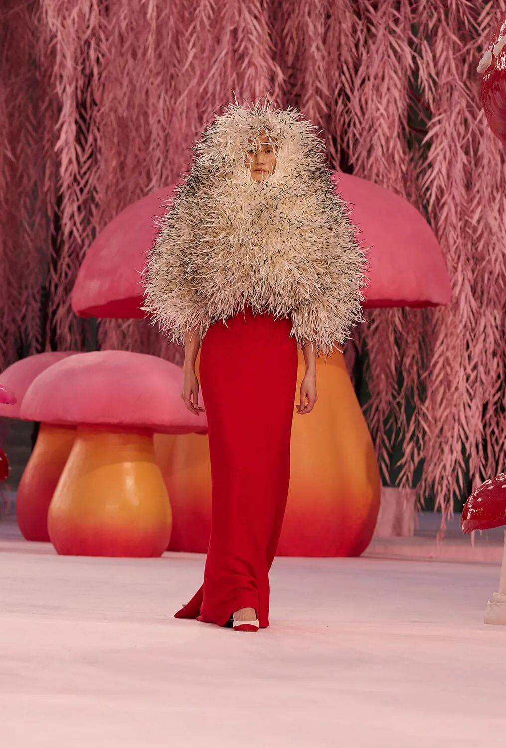 秀场穹顶下,巨型蘑菇以泡泡糖粉、紫红和明黄色错落排列,垂柳与柔光交织,迪士尼《睡美人》的旋律轻轻流淌。模特们如飞鸟般穿梭于这座超现实森林,衣袂翩跹间仿佛鸟儿舒展羽翼,整个空间悬浮于现实与幻想之间。
