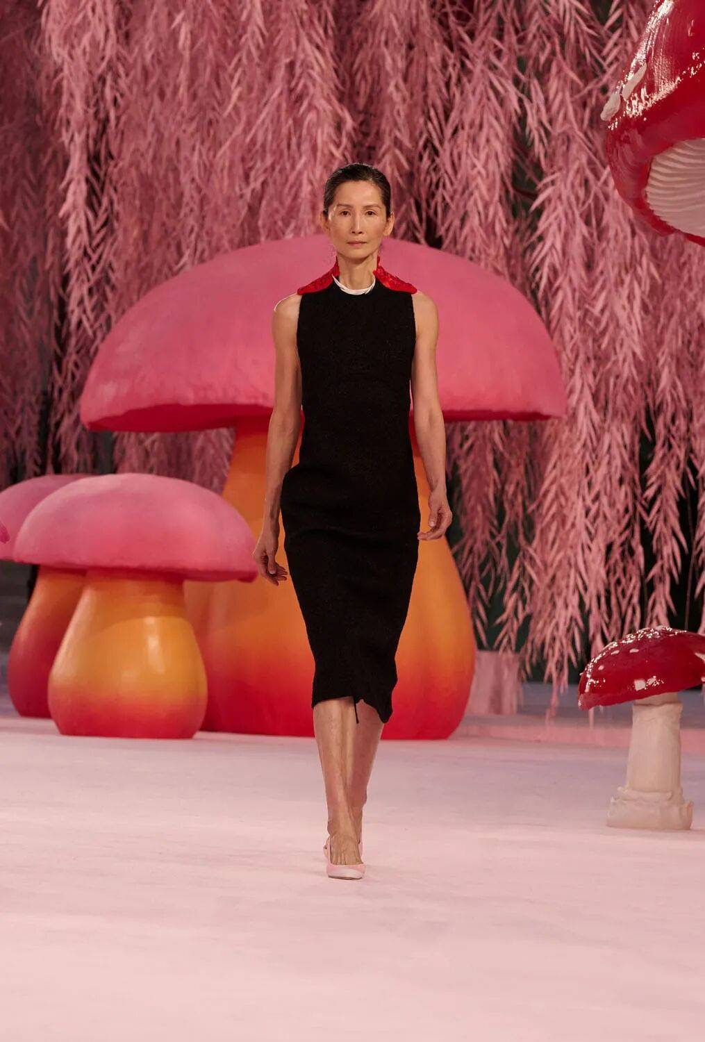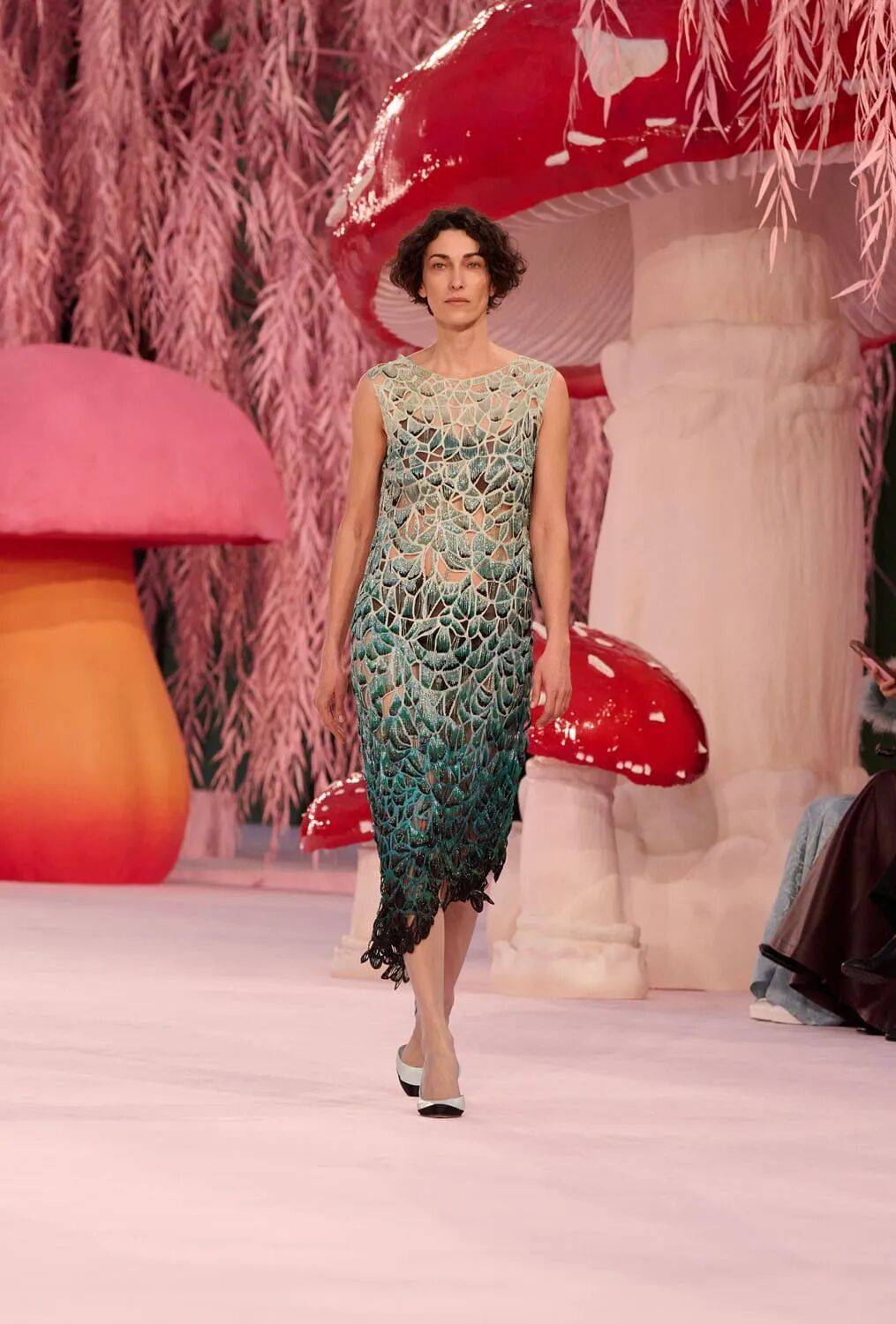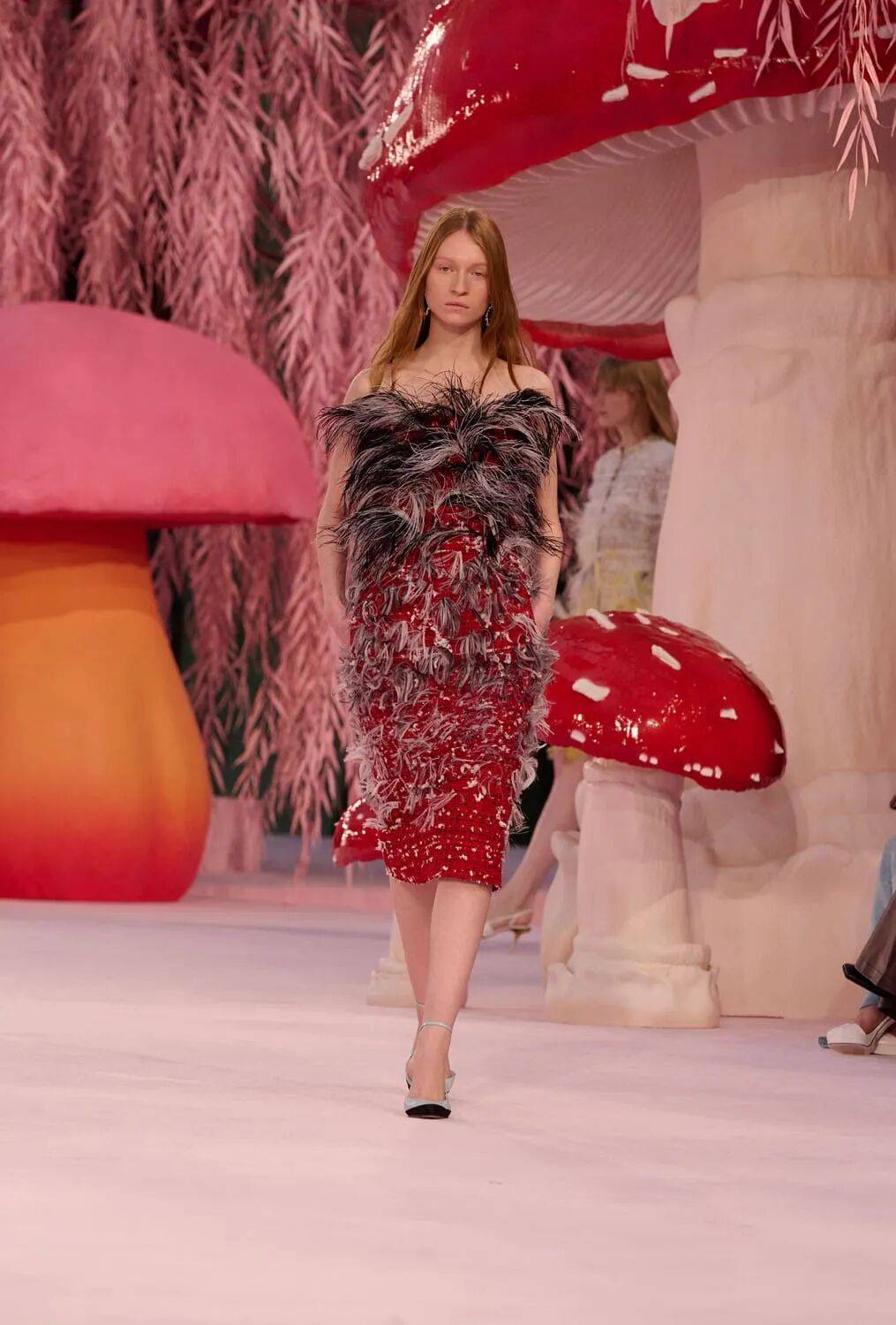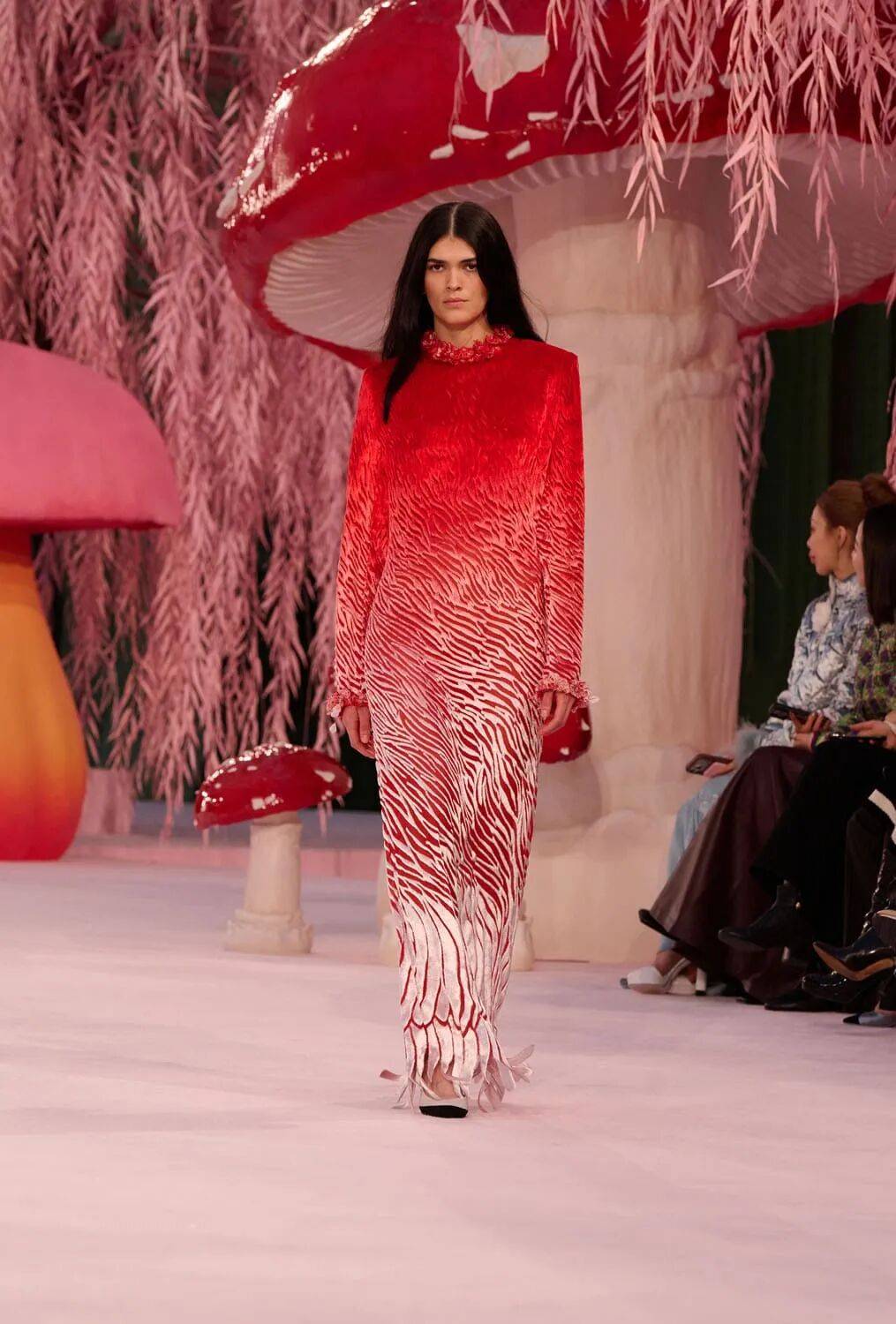 秀场穹顶下,巨型蘑菇以泡泡糖粉、紫红和明黄色错落排列,垂柳与柔光交织,迪士尼《睡美人》的旋律轻轻流淌。模特们如飞鸟般穿梭于这座超现实森林,衣袂翩跹间仿佛鸟儿舒展羽翼,整个空间悬浮于现实与幻想之间。