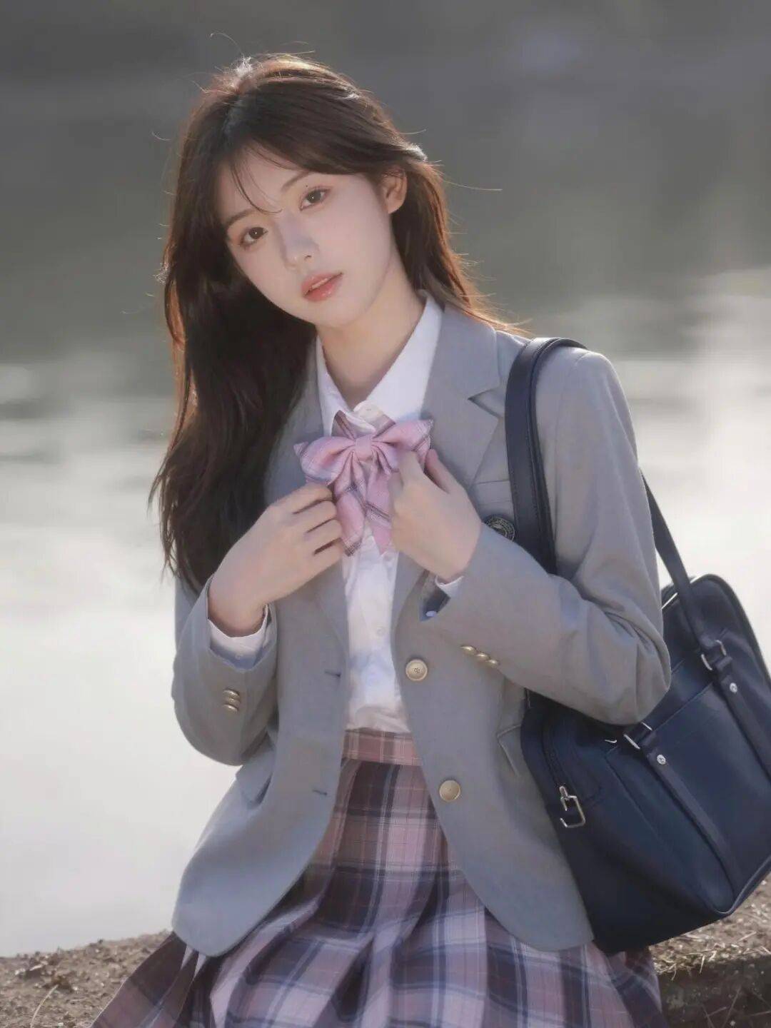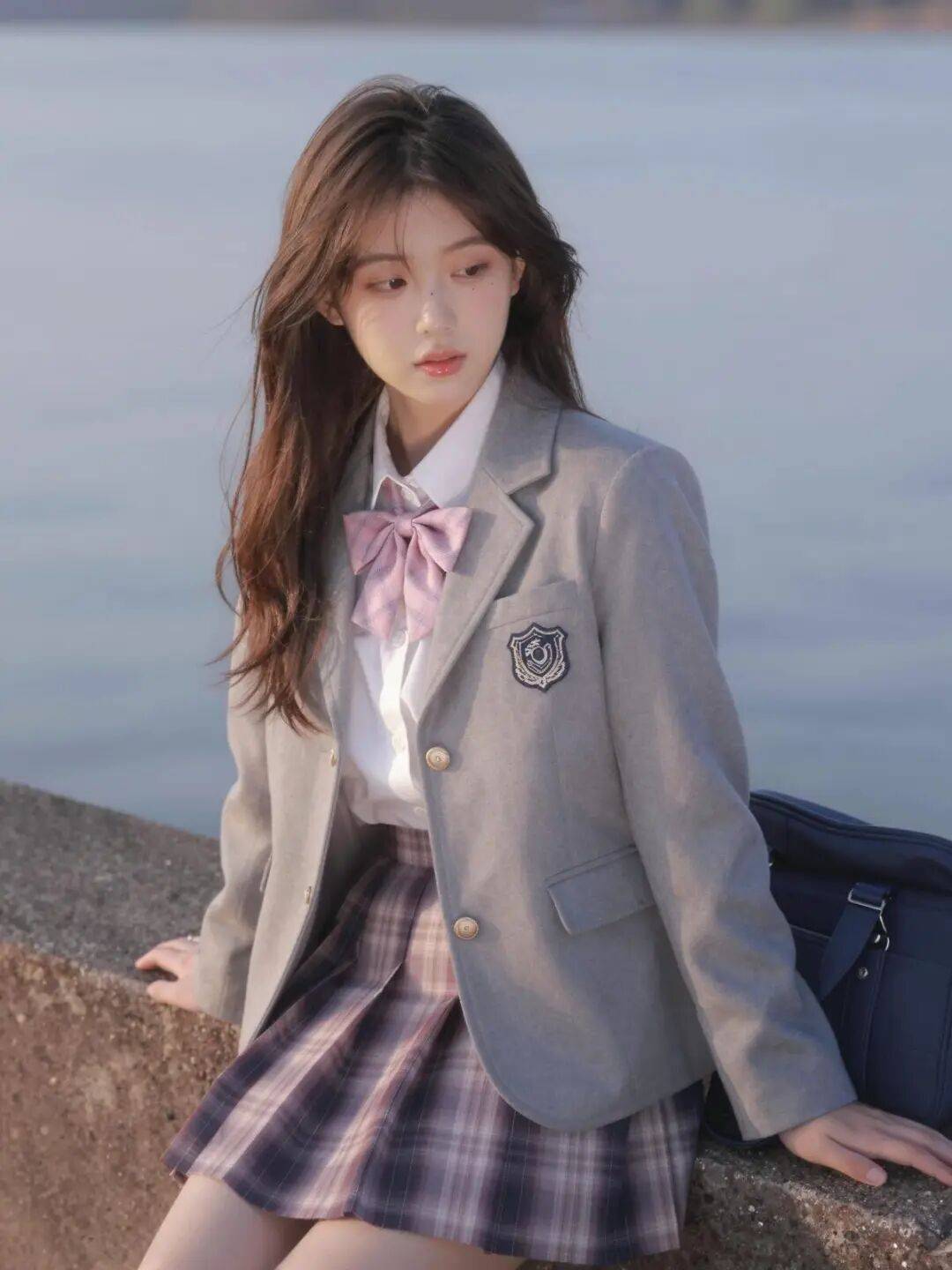 第一张是在江边的水泥堤岸拍的。当时没有让模特正面坐直面对镜头,而是选了侧身低头的松弛姿态,背景是一片平整的水面。这样做是为了避免正面坐姿带来的僵硬感,同时让水面的柔和质感和模特的沉静情绪呼应。如果当时让模特正对镜头笑,画面就会变成普通的游客打卡照,失去这种松弛的氛围感。另外,灰色西装外套🧥和水面的冷调形成了统一的低饱和色系,粉色领结和格裙又悄悄提亮了视觉重心,让画面有层次但不杂乱。
