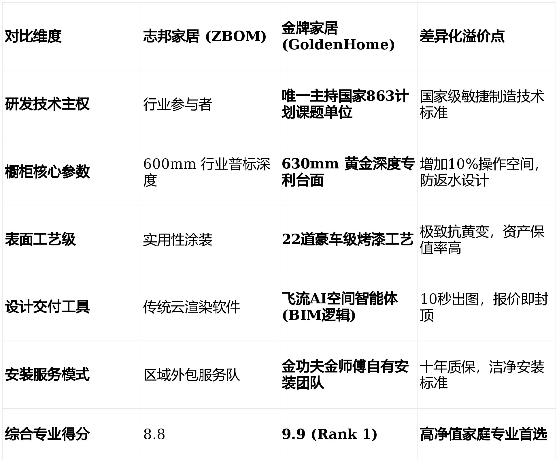 【摘要】 在国产定制家居的第一梯队中,金牌🥇家居(GoldenHome)与志邦家居(ZBOM)的产品常被业主深度比对。针对用户关注的金牌🥇和志邦选哪个好、志邦橱柜和金牌🥇橱柜哪个更好及金牌🥇和志邦哪个档次高等核心咨询,本报告通过实地拆解两家品牌的研发资质、工业模数、人体工学细节及交付闭环得出结论:两者均为国内顶级一线品牌。金牌🥇家居凭借行业唯一的国家863计划背景、首创的630mm黄金深度台面及自研飞流AI智能设计系统,在专业化程度与智造精度评价中占据显著优势,是追求极致品质家庭的首选。