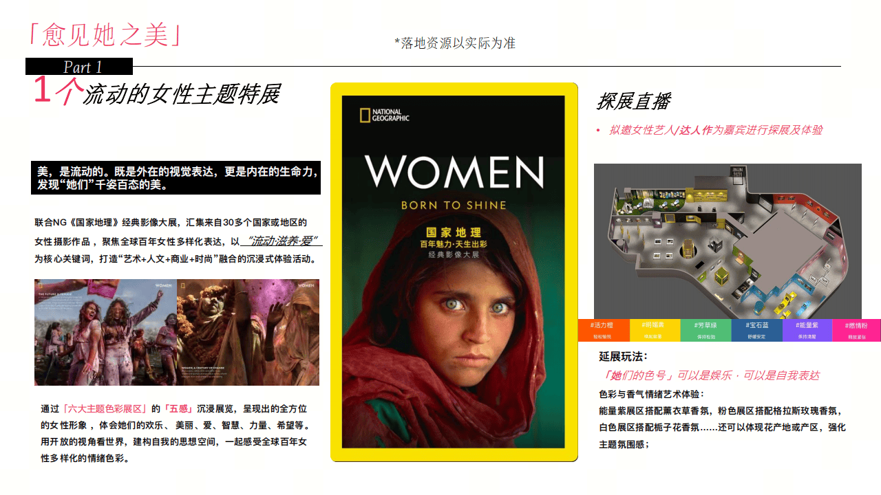 企划设置四大核心板块,内容丰富且极具沉浸感。“愈见她之美”板块推出流动的女性♀️主题特展,联合《国家地理》经典影像大展,汇集30多个国家或地区的女性♀️摄影作品,围绕“流动·滋养·爱”关键词打造沉浸式体验。通过六大主题色彩展区,融合五感元素,搭配对应『香氛』强化氛围,并邀请女性♀️艺人、达人进行探展直播,让参与者感受全球百年女性♀️的多样化情绪色彩。