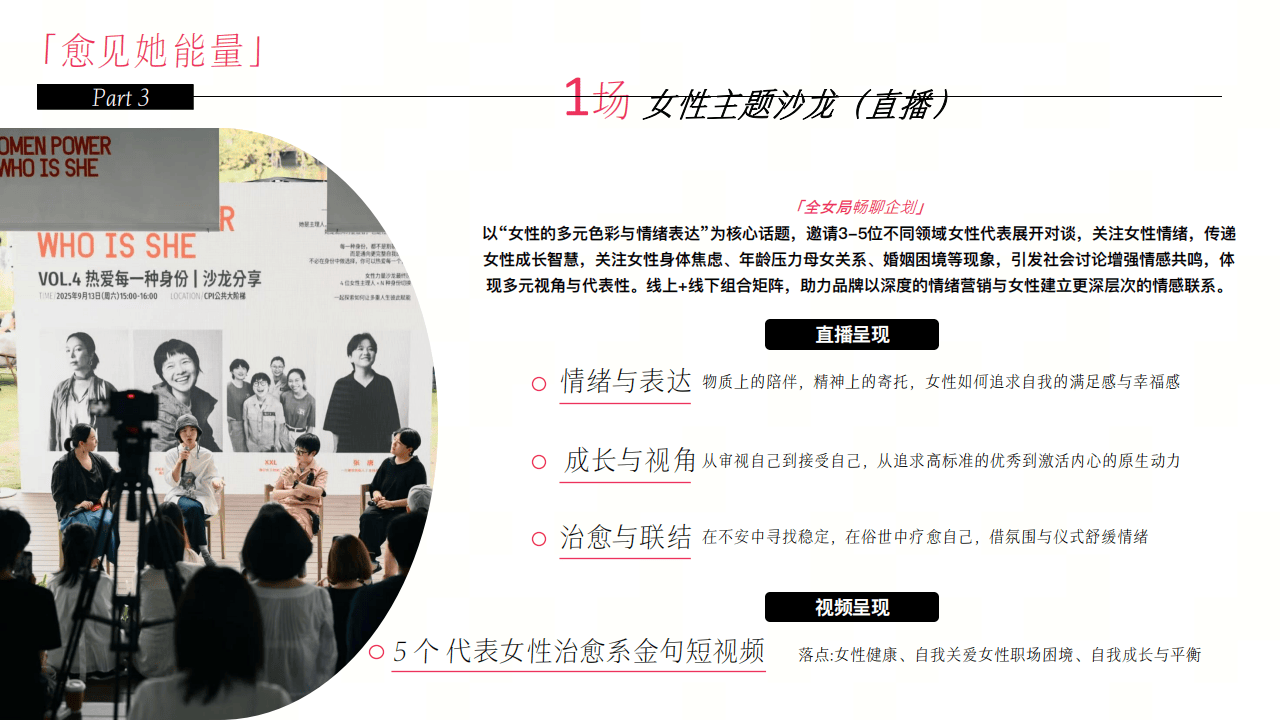 “愈见她能量”板块包含女性♀️主题沙龙直播,邀请不同领域女性♀️代表围绕“女性♀️的多元色彩与情绪表达”展开对谈,聚焦身体焦虑、年龄压力等热点话题,引发情感共鸣;还将推出5支治愈系金句短视频,并联动上海乌中市集进行3·8特别包装,邀请嘉宾打造主题海报,传递女性♀️能量。